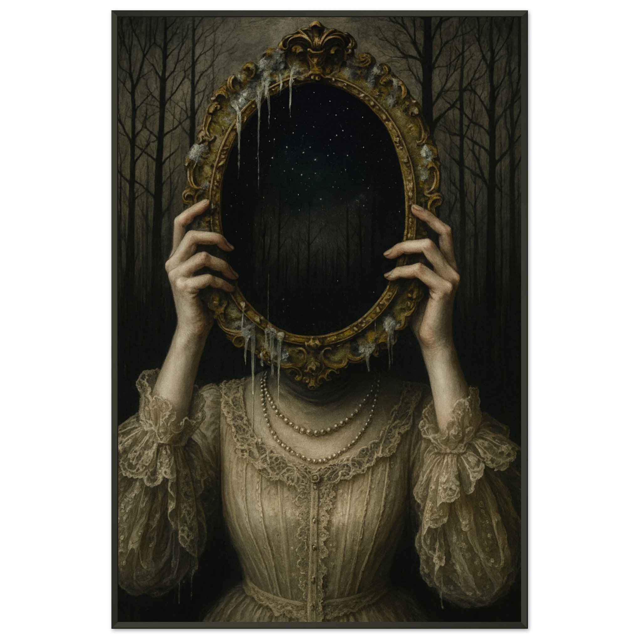 The Metal Framed Poster captures a mysterious figure in vintage lace, her face replaced by an ornate mirror reflecting a starlit sky. This surreal imagery evokes mystery, introspection, and gothic elegance. With Giftomory’s ethos of Gift + Memory, this gift is for dreamers, art lovers, and those who embrace haunting beauty and dark fantasy in their living spaces.