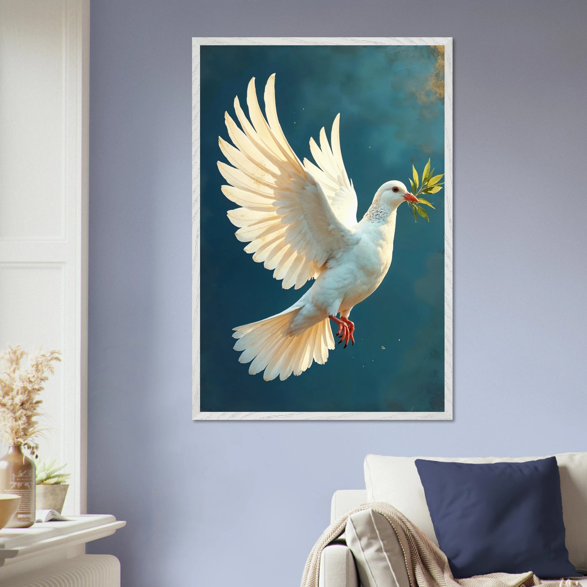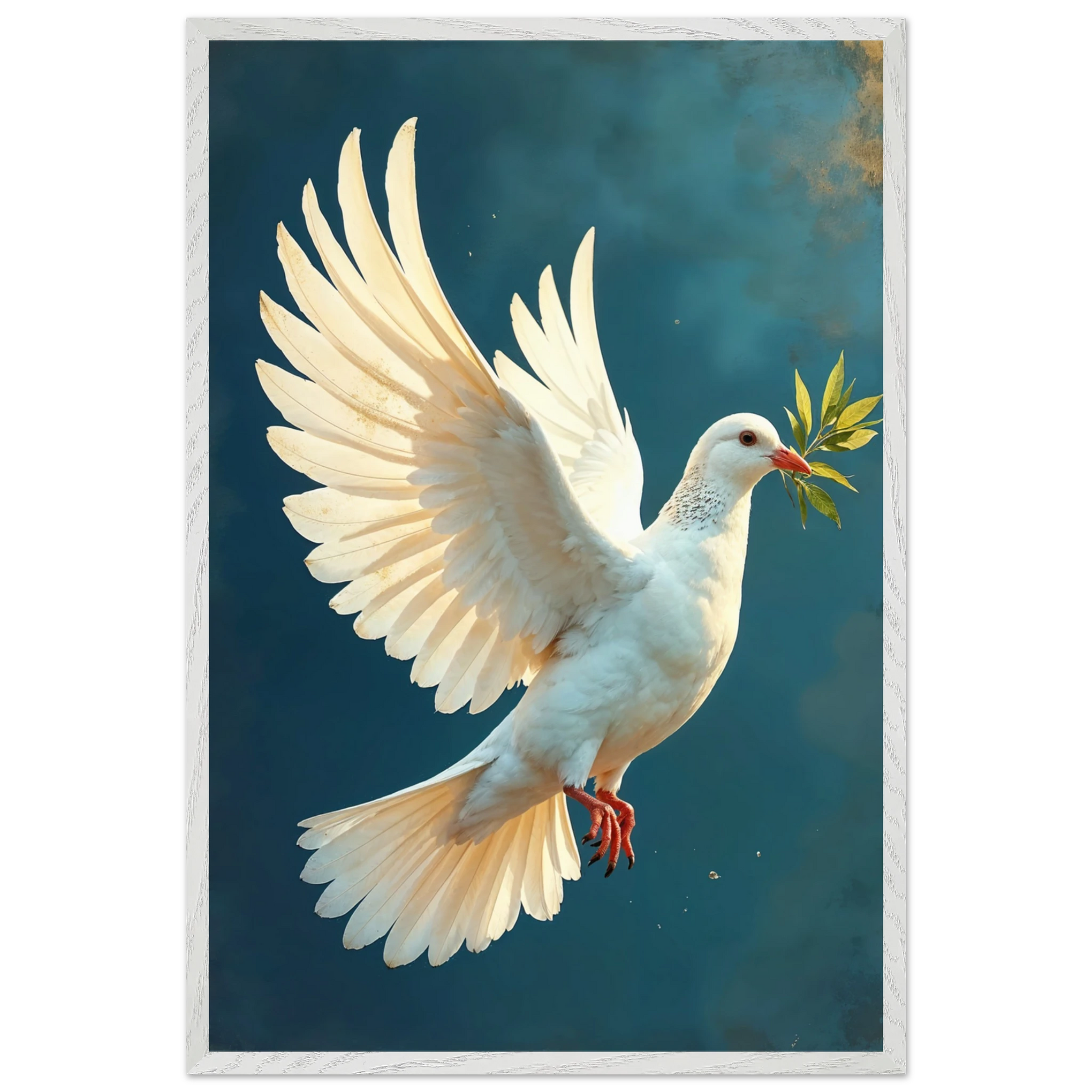 Embodying the essence of peace and serenity, this Premium Wooden Framed Poster features a radiant white dove against a deep sky, delicately holding an olive branch. The soft golden tones on its wings, set against rich blues, create a sense of hope, purity, and spiritual renewal. This gift is perfect for someone seeking comfort, starting a new journey, or cherishing loved ones who bring light into life. Make it memorable. Gift it to yourself or someone else. Crafted to inspire and last: