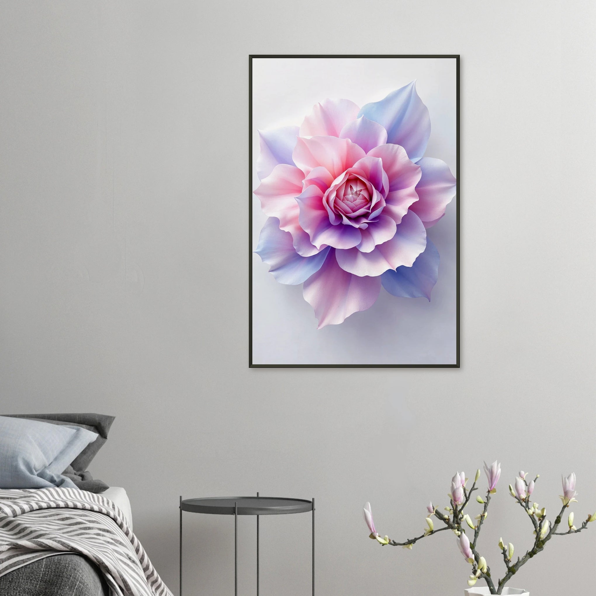 This "Pastel Bloom" framed poster captures the ethereal beauty and tranquil elegance of a pastel-colored flower, embodying the essence of Giftomory by merging "Gift" and "Memory." The soft, blending hues and the velvety texture of the petals evoke feelings of peace, gentle beauty, and the timeless appeal of floral art. Imagine this piece adorning a living room, bedroom, or meditation space, creating an ambiance of calm sophistication and artistic inspiration. The detailed rendering and the serene color palette make it a captivating focal point. The artistic elements, such as the digital illustration style, the pastel color palette, and the soft textures, contribute to a memorable and impactful visual experience, making it a perfect gift to cherish and remember moments of artistic appreciation and serene beauty.