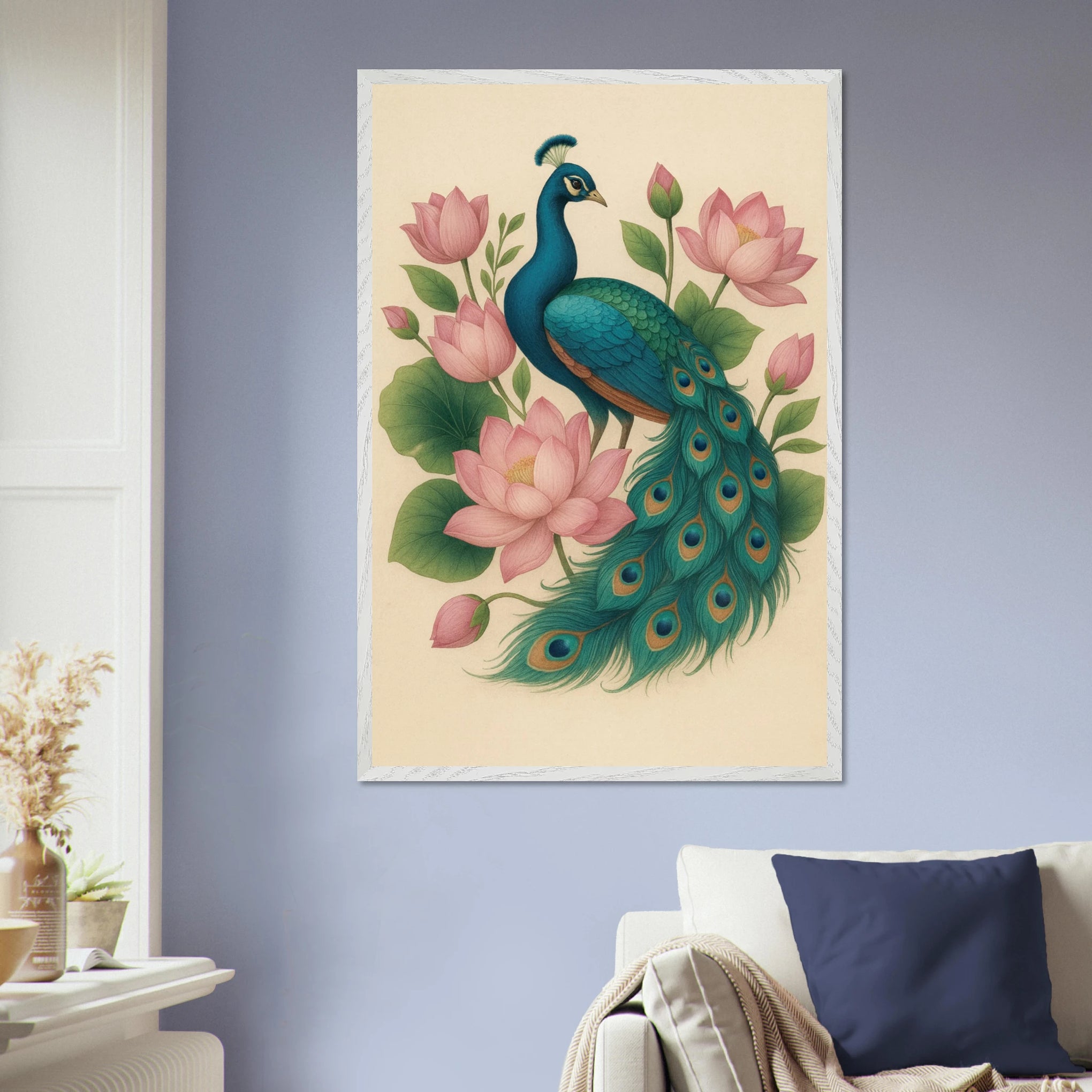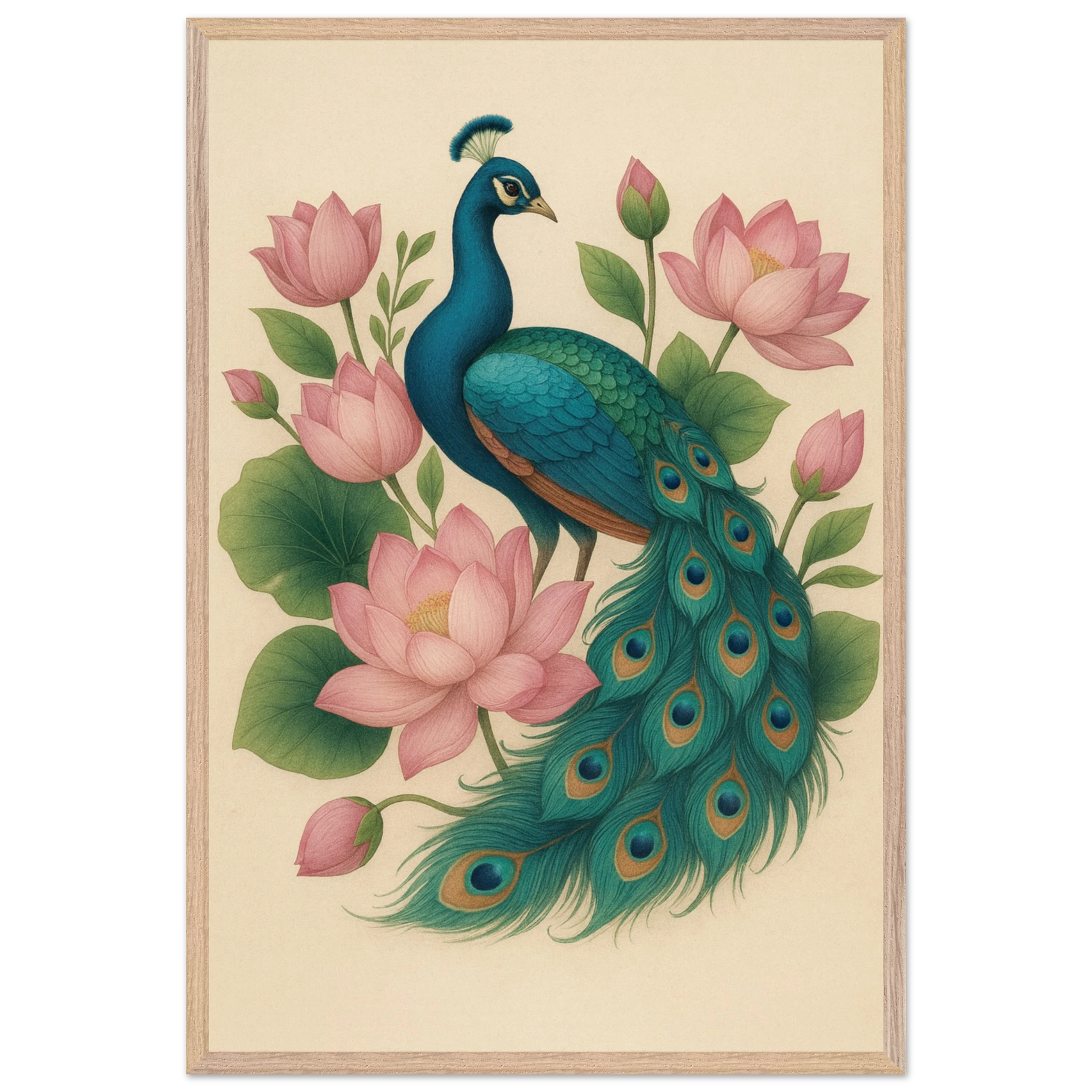 This Wooden Framed Poster captures the regal poise of a peacock surrounded by blooming lotus flowers — a symbol of beauty, renewal, and tranquility. The rich teal, pink, and green hues create a calming aura perfect for any elegant setting. Embodying Giftomory’s Gift + Memory philosophy, it celebrates grace and peaceful reflection.