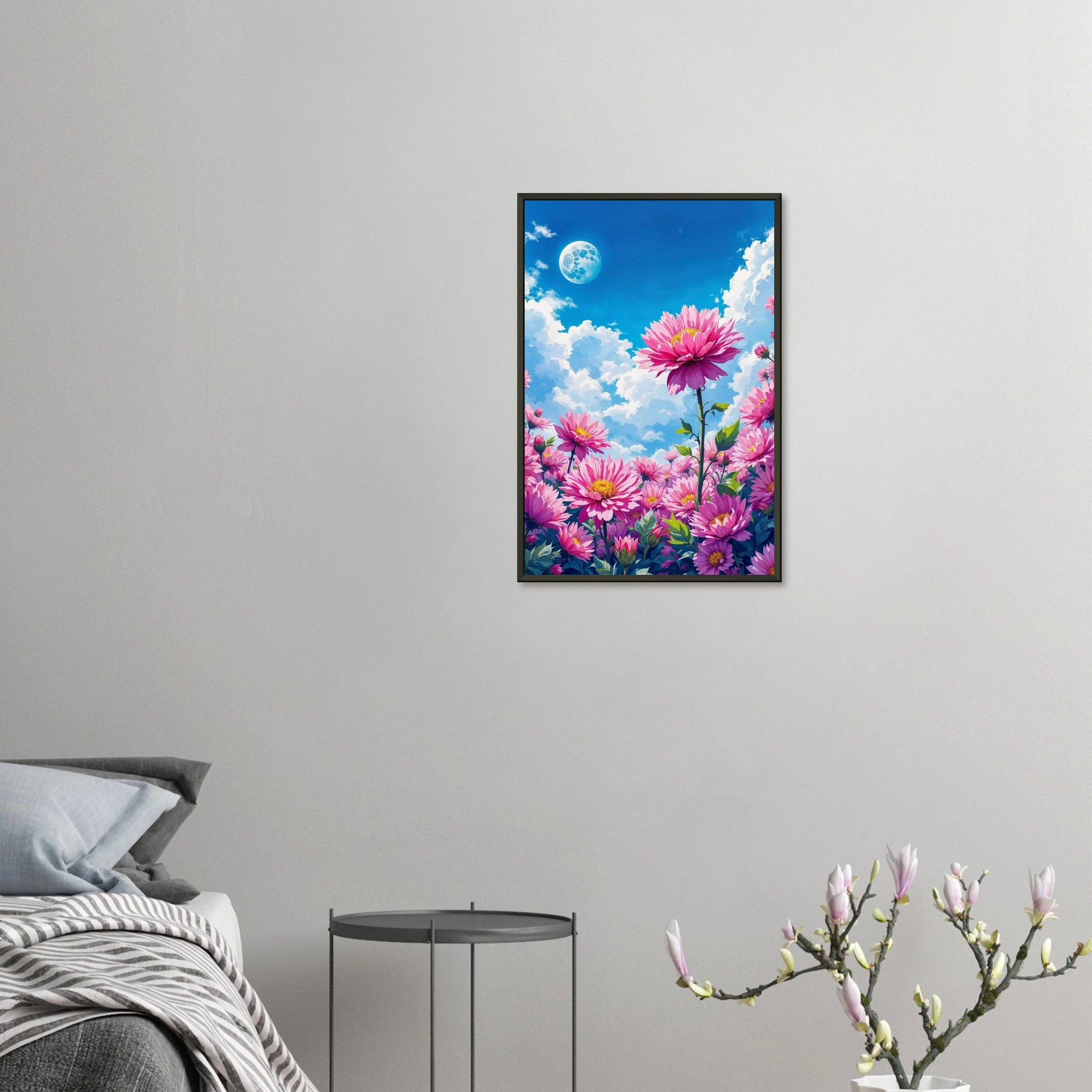 This "Pink Bloom Moon" framed poster captures the vibrant beauty and cheerful spirit of a floral meadow under a bright sky, embodying the essence of Giftomory by merging "Gift" and "Memory." The pink flowers, the blue sky, and the pale moon evoke feelings of joy, serenity, and the simple beauty of nature. Imagine this piece adorning a living room, bedroom, or creative space, creating an ambiance of cheerful inspiration and natural wonder. The fluffy clouds and the detailed flowers make it a captivating focal point. The artistic elements, such as the vibrant colors, the detailed flowers, and the whimsical composition, contribute to a memorable and impactful visual experience, making it a perfect gift to cherish and remember moments of joy and natural beauty.