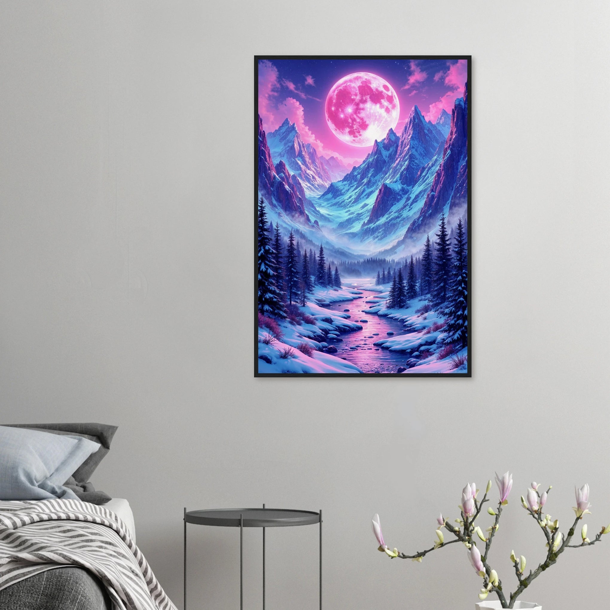 This "Pink Moon Vista" framed poster captures the ethereal beauty and dreamlike tranquility of a landscape bathed in the glow of a pink moon, embodying the essence of Giftomory by merging "Gift" and "Memory." The vibrant pink moon and the cool, serene mountains evoke feelings of wonder, peace, and the transcendent beauty of nature. Imagine this piece adorning a living room, bedroom, or meditation space, creating an ambiance of dreamy serenity and artistic inspiration. The winding river and the evergreen trees add to the depth and narrative, making it a captivating focal point. The artistic elements, such as the surreal color palette, the detailed landscape, and the luminous moon, contribute to a memorable and impactful visual experience, making it a perfect gift to cherish and remember moments of peace and otherworldly beauty.