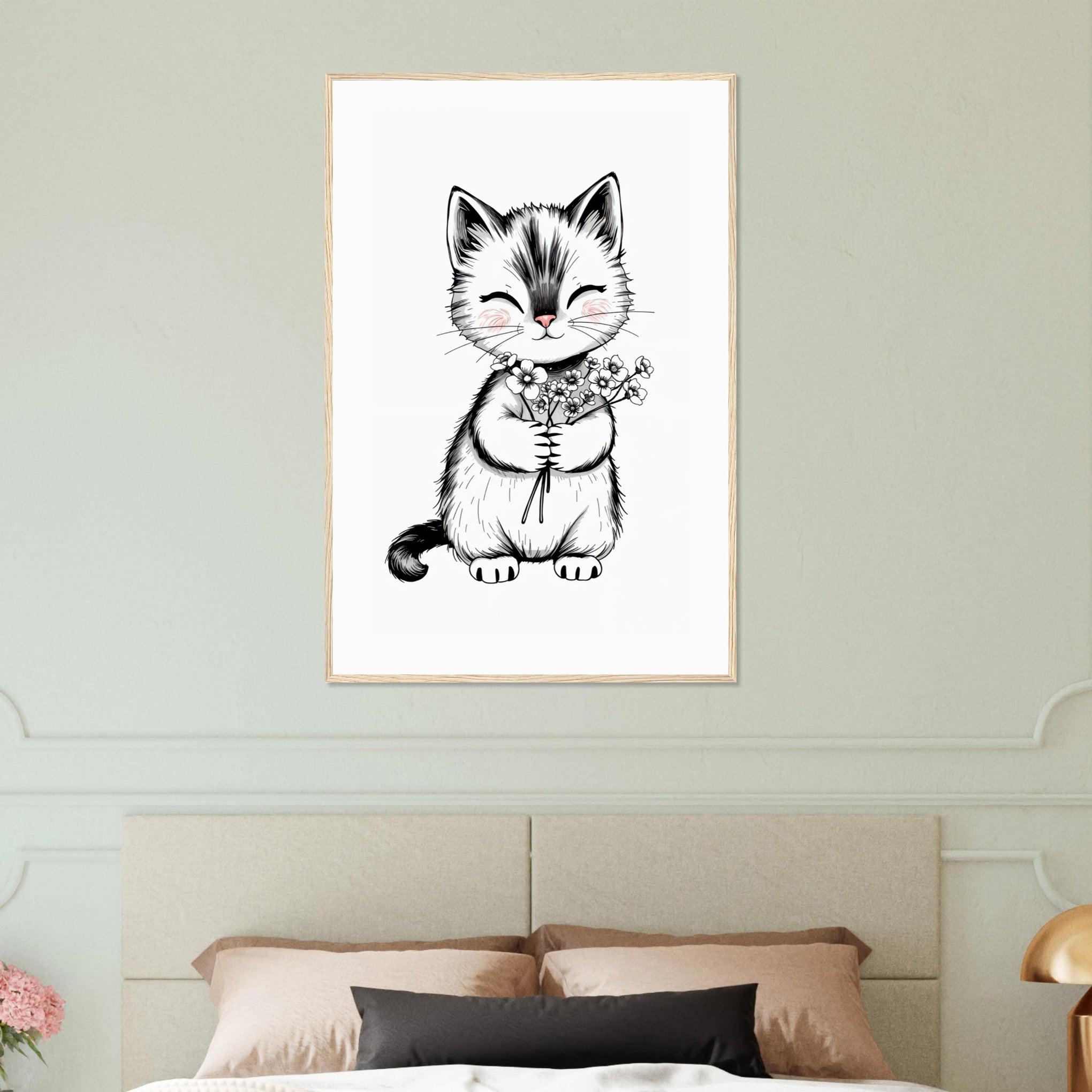Bring a touch of heartwarming sweetness into your home with our "Purrfect Gift" framed print. This adorable design features a charming kitten, its eyes closed in contentment, clutching a small bouquet of delicate flowers. The image evokes feelings of warmth, tenderness, and innocent joy, reminiscent of the unconditional love and playful spirit of our feline companions. The simple, clean aesthetic of the black and white sketch with subtle hints of blush pink makes the kitten the focal point, emphasizing its irresistible cuteness. This design is a beautiful reminder of the simple joys in life and the pure, unadulterated love that pets bring into our lives. Imagine this delightful artwork adorning a nursery, a child's room, or any space that could use a touch of sweetness and lightheartedness. At Giftomory, we believe in the power of merging "Gift" and "Memory," and this piece is a testament to that ethos—a perfect present for a loved one, or a special treat for yourself. The delicate lines of the sketch, the kitten's expressive features, and the charming floral accent all contribute to the overall mood of gentle affection.