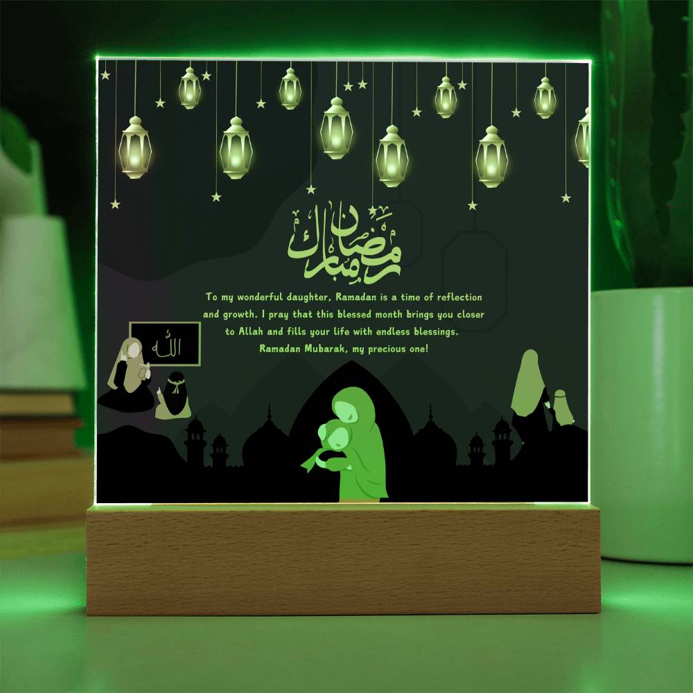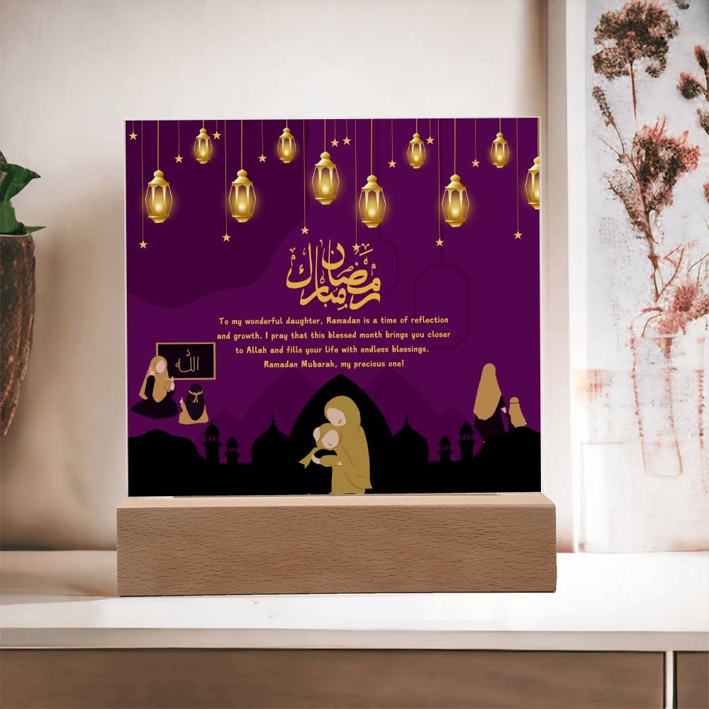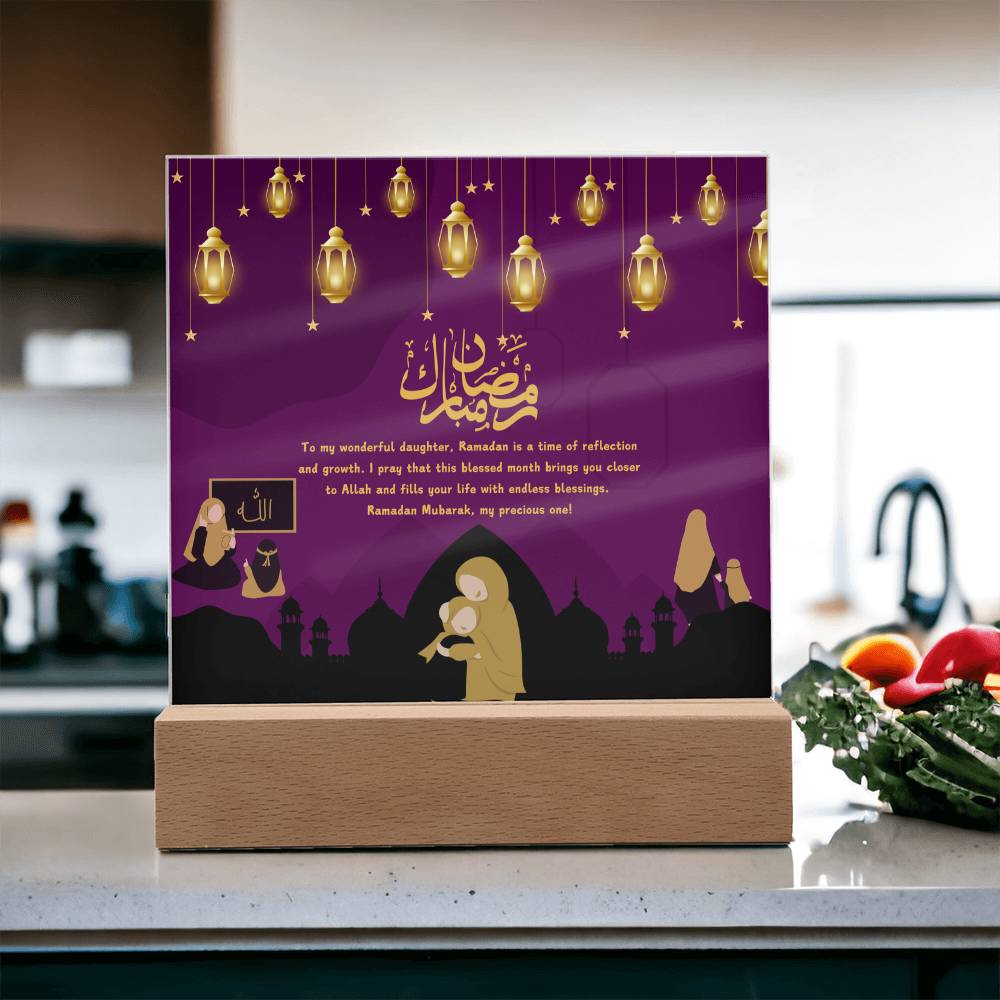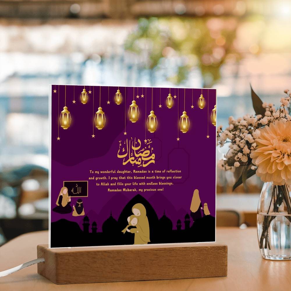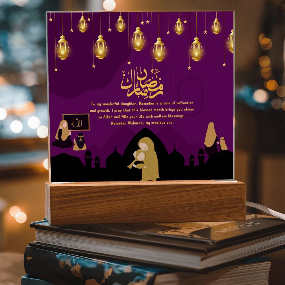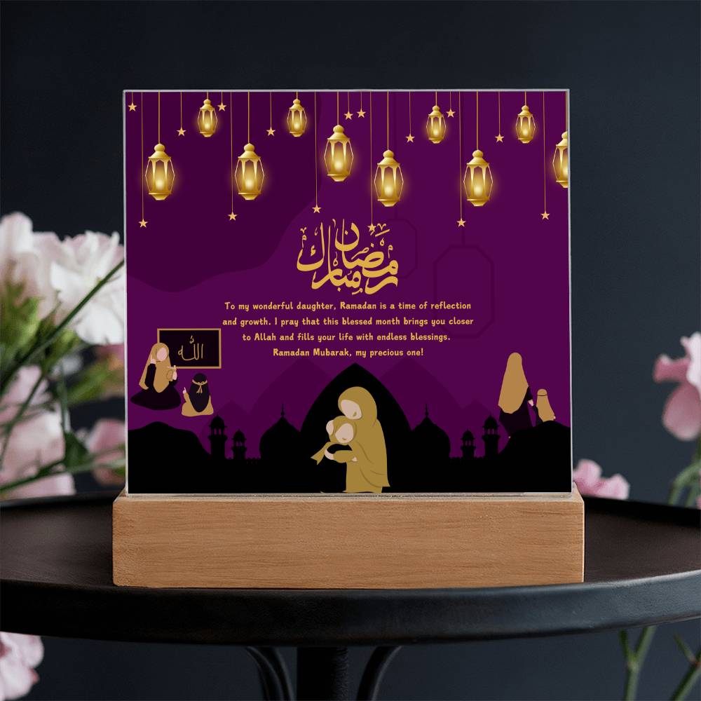 This "Ramadan Blessings: Wonderful Daughter" acrylic plaque is more than just a decorative piece; it's a heartfelt expression of love and spiritual devotion for a cherished daughter, embodying the essence of Giftomory by merging "Gift" and "Memory." The deep purple background, adorned with hanging lanterns and mosque silhouettes, evokes the serene and sacred atmosphere of Ramadan. The illustrations of mothers and daughters in various scenes add a personal touch, while the loving message conveys deep affection and prayers. Imagine this plaque displayed in your daughter's room, prayer area, or living space, creating an ambiance of warmth, love, and spiritual reflection. The framed "Allah" illustration on the left symbolizes the divine connection, making it a perfect gift to cherish and remember the spiritual bond during this holy month. The artistic elements, such as the rich colors, detailed illustrations, and thoughtful composition, contribute to a serene and meaningful visual experience.