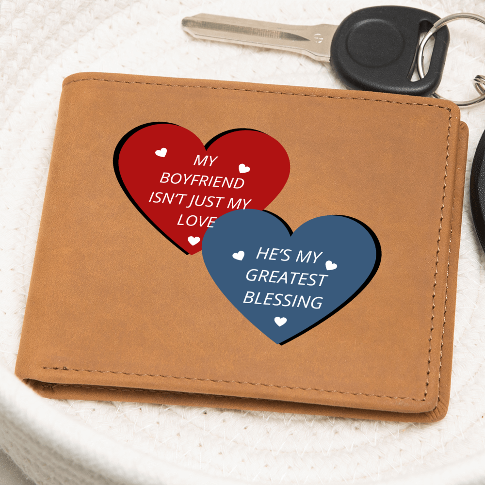 Our Graphic Leather Wallet beautifully captures the depth of love with its design of two overlapping hearts—one red, symbolizing passion, and one blue, representing trust. The heartfelt message "My Boyfriend Isn't Just My Love, He's My Greatest Blessing," written in white, is adorned with small white hearts, adding a tender touch. Perfect for a romantic, reflective ambiance—like a quiet evening stroll—this wallet’s bold colors and meaningful words evoke gratitude and devotion. Giftomory: Where Gift Meets Memory, this wallet is an ideal gift for the man who is your greatest blessing, preserving the memory of your bond.