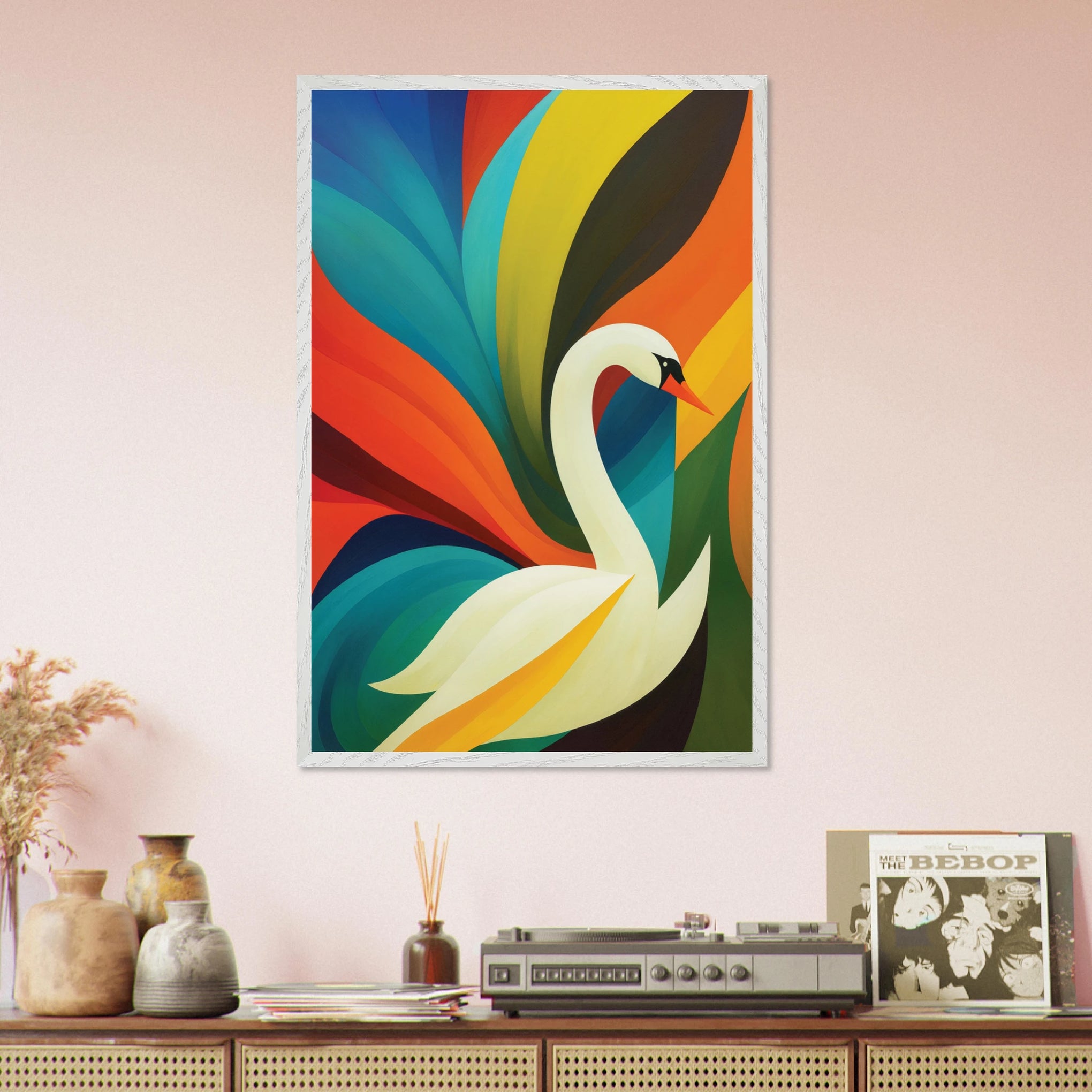 Embrace timeless grace with this Wooden Framed Poster featuring an elegant white swan surrounded by sweeping rainbow waves in retro 70s style. Vivid oranges, teals, yellows, and deep blues flow dynamically, creating an ambiance of sophistication and nostalgic warmth. The swan's serene posture symbolizes beauty, transformation, and elegance. This gift is for art lovers, vintage enthusiasts, and those who appreciate refined aesthetics and meaningful symbolism. At Giftomory, we believe every piece merges Gift + Memory, honoring moments of grace and the enduring beauty of cherished memories.