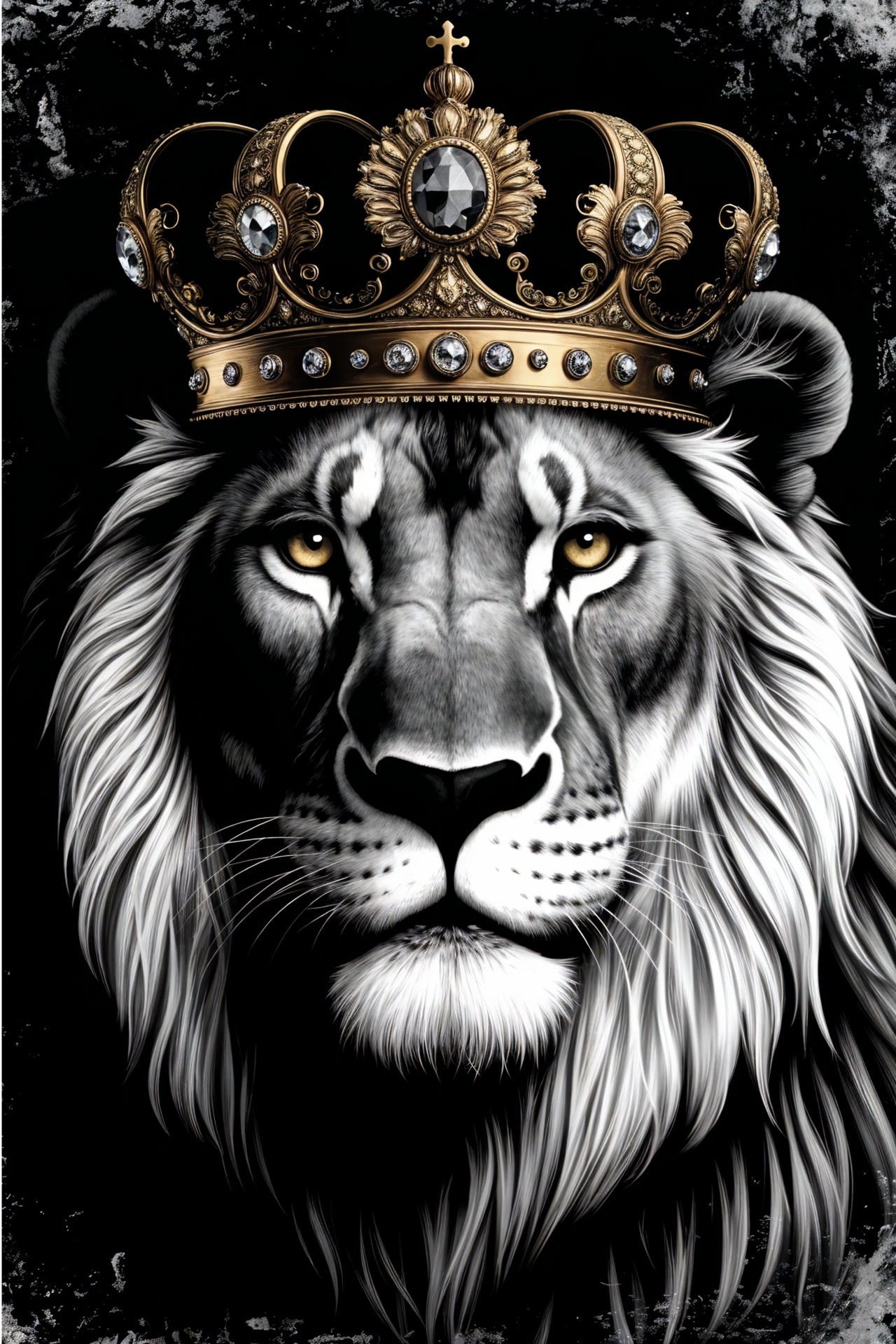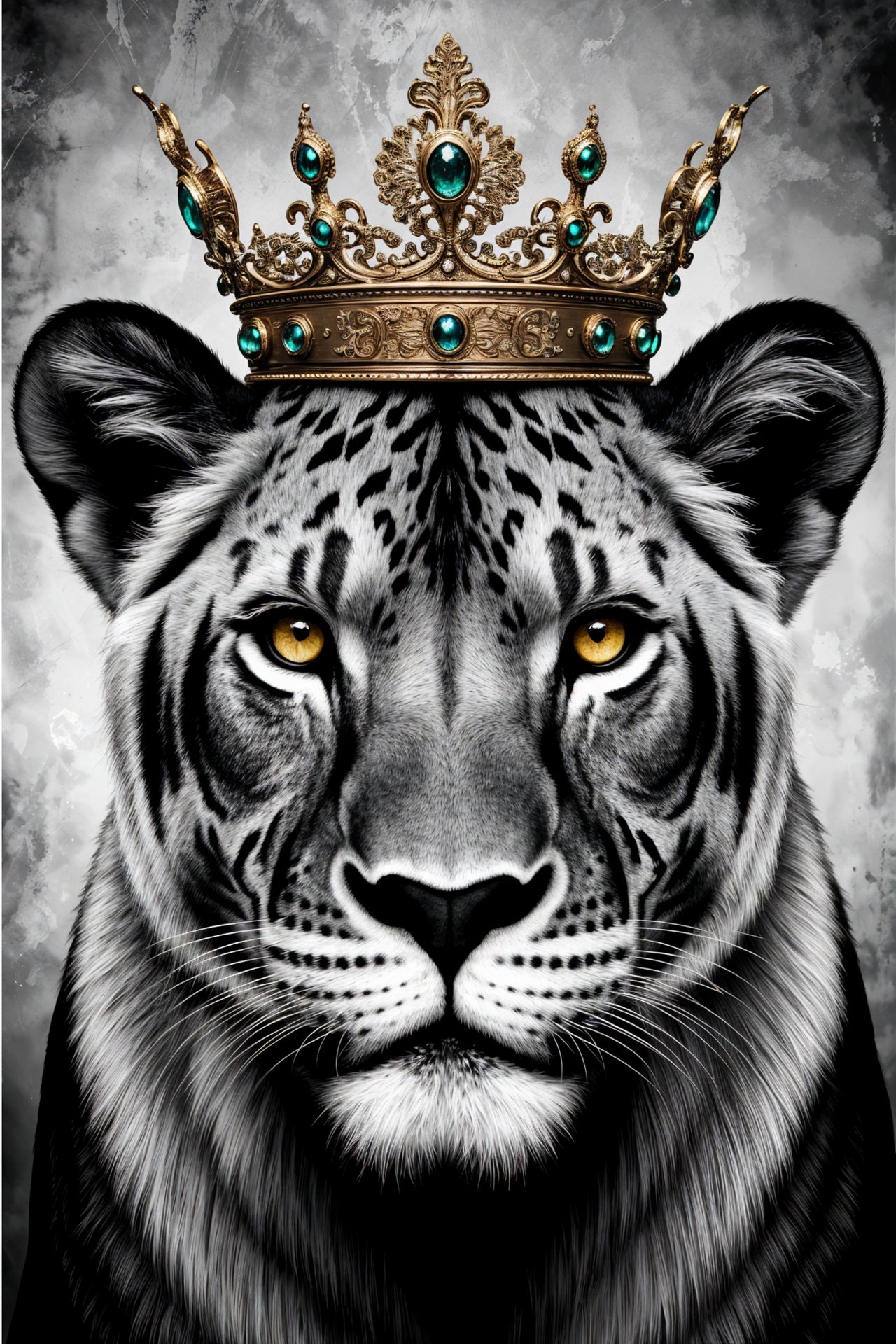 This awe-inspiring two-piece set captures the unmatched grace and authority of two of nature’s most powerful predators—the lion and the tiger—reimagined as crowned monarchs of the wild. The lion, adorned in a baroque-style gold crown, stares with unwavering confidence. Beside him, the tiger wears an ornate emerald-studded crown, his amber eyes filled with quiet defiance. Both portraits are rendered in striking grayscale, with detailed fur textures and subtle lighting that enhance the contrast between shadow and sheen. The matte finish deepens the drama, while the selective color in the crowns draws attention to their royal symbolism—strength, leadership, and legacy. Make it memorable—gift it to yourself or someone else.
