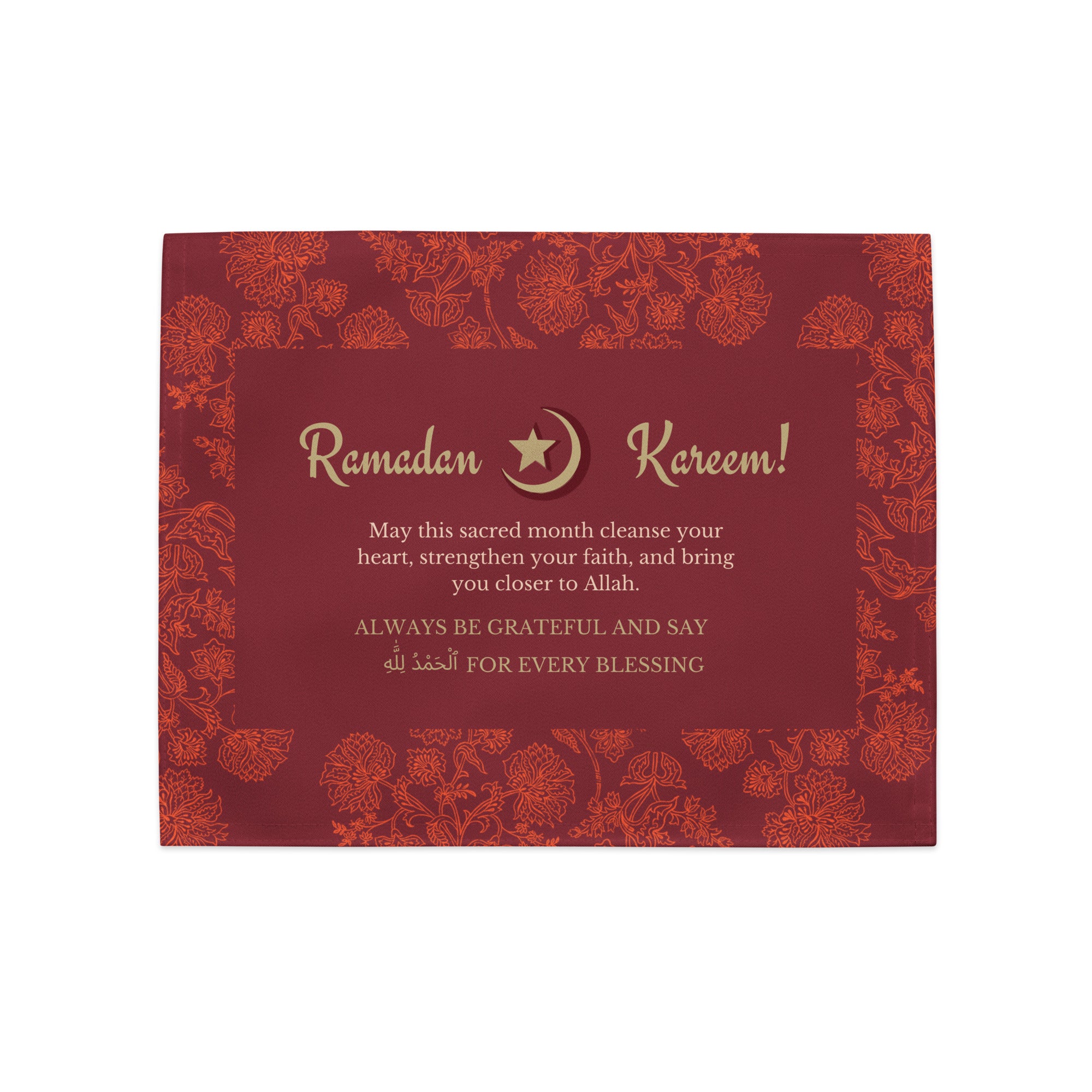 This design is for anyone who cherishes beauty in faith and gratitude during the sacred month. The Ramadan Blessings: Elegant Floral Placemat Set features a deep burgundy background highlighted with ornate golden florals, a glowing crescent moon, and a star—symbols of Ramadan’s spiritual essence. The phrase “Always Be Grateful and Say Alhamdulillah for Every Blessing” reinforces the spirit of thankfulness at every meal. A heartfelt design from Giftomory—where every Gift becomes a Memory—this placemat set enriches Iftar and Suhoor with grace and reverence.