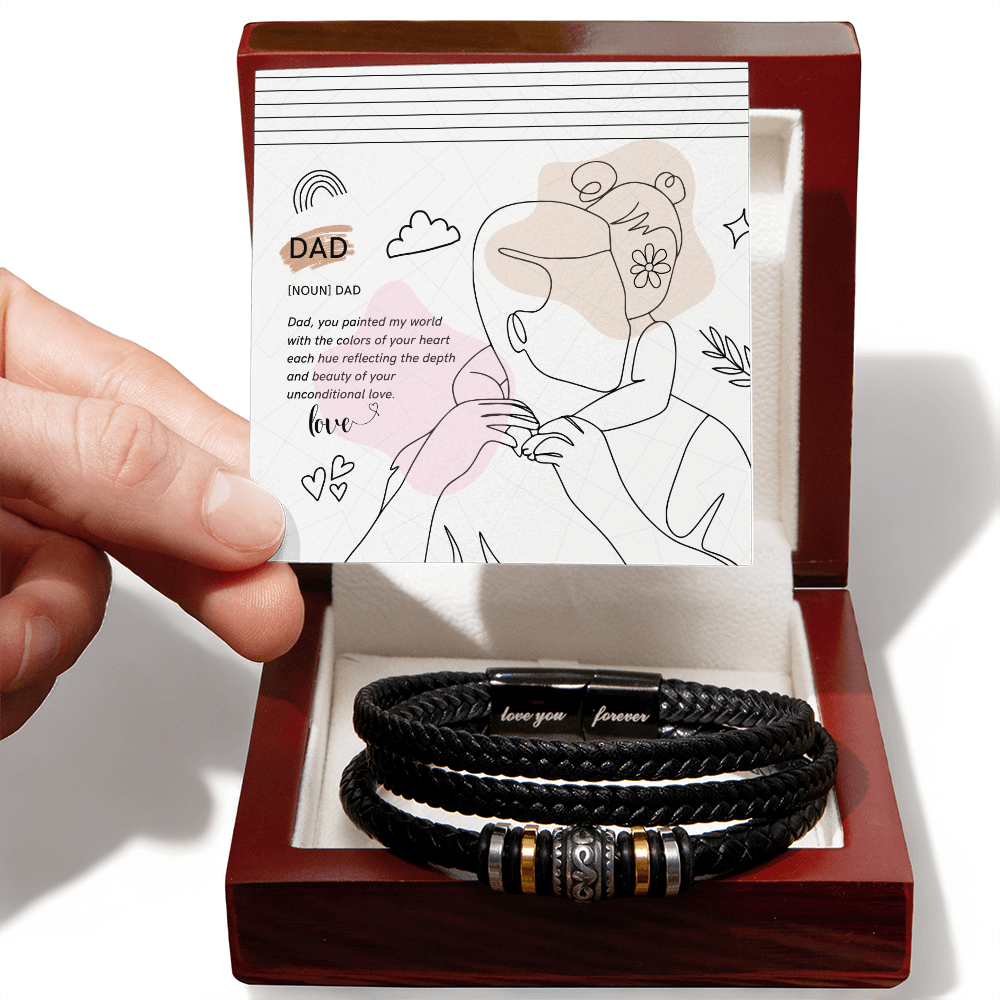 The Men’s Bracelet – Love You Forever is inspired by the emotional vibrancy of a father’s love — subtle, strong, and soul-shaping. With its smooth vegan leather braid and engraved sentiment, this piece reflects heartfelt memories, much like a brushstroke on the canvas of life. This gift is for a father who painted your world with warmth and wisdom. Reflecting the Giftomory promise — where every Gift becomes a living Memory — this bracelet is a timeless expression of appreciation.