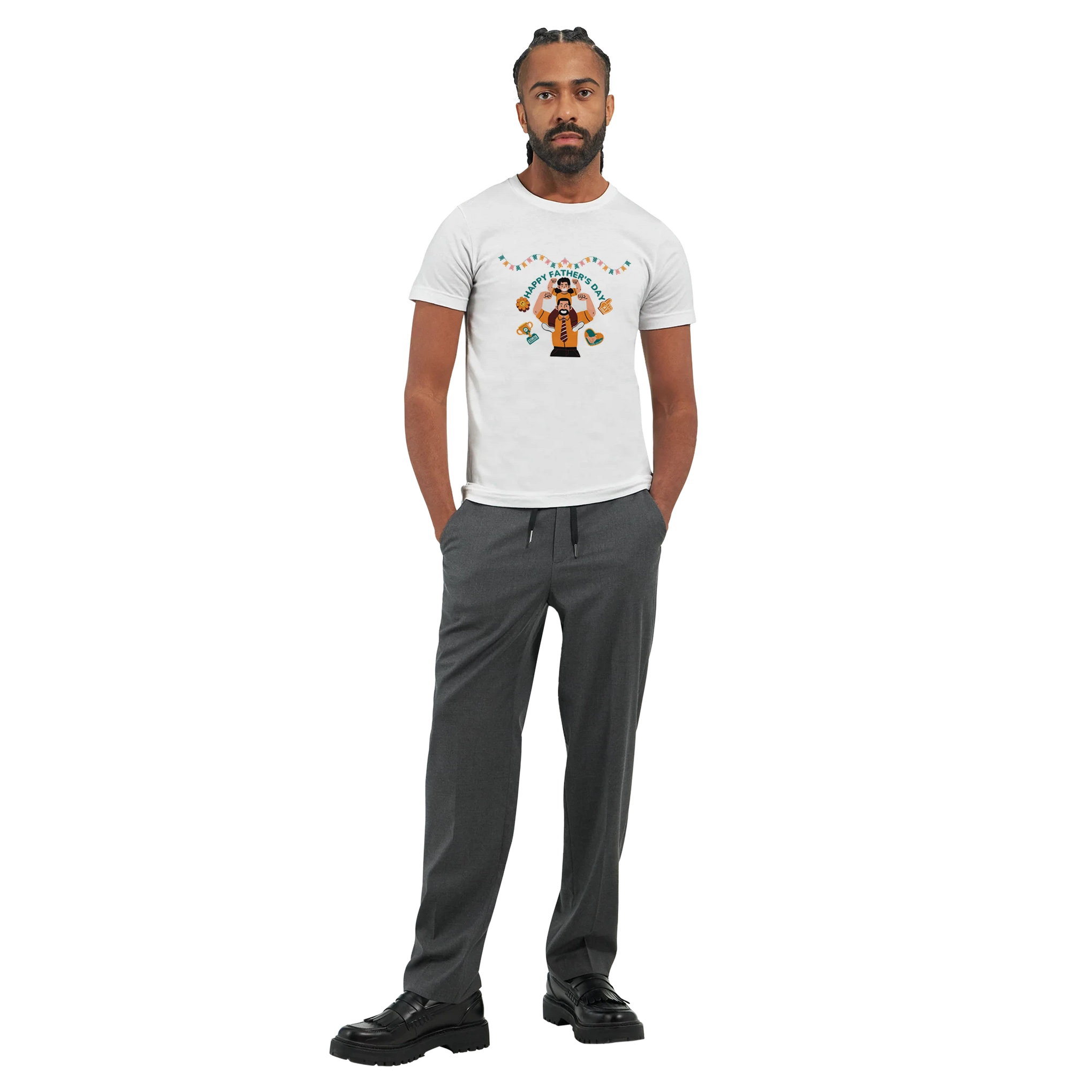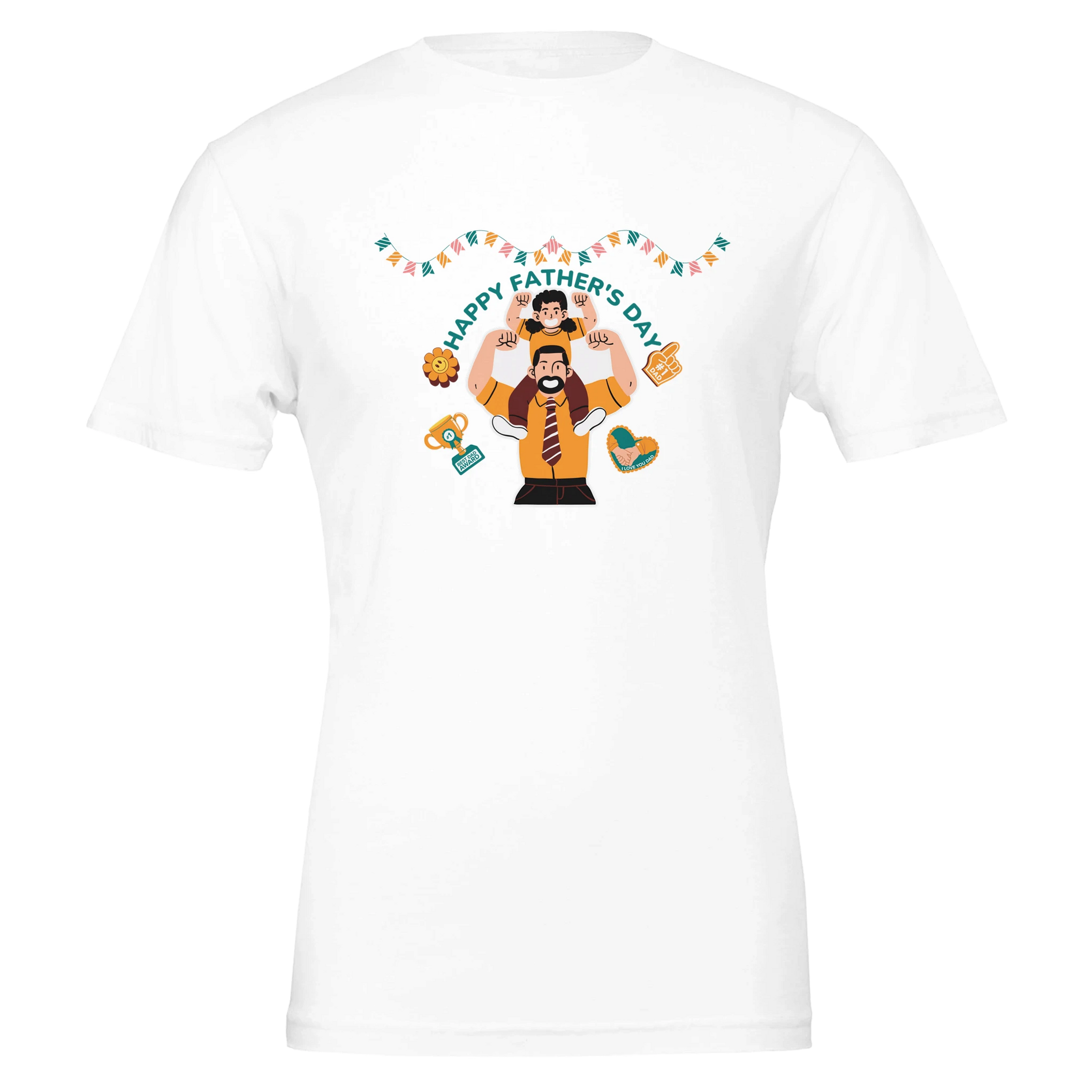This design is for the dad who’s a hero every day—Father’s Day Celebration Tee captures the love, laughter, and support only a father can give. Featuring a joyful image of a child on their dad’s shoulders, surrounded by hearts, banners, and trophies, this design is bursting with energy and appreciation. It’s a perfect Father’s Day gift for the man who lifts everyone up. Make it memorable. Gift it to yourself or someone else.