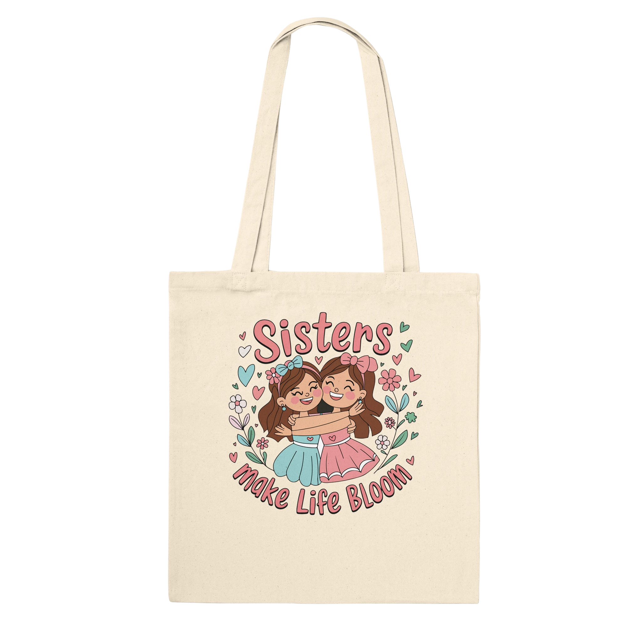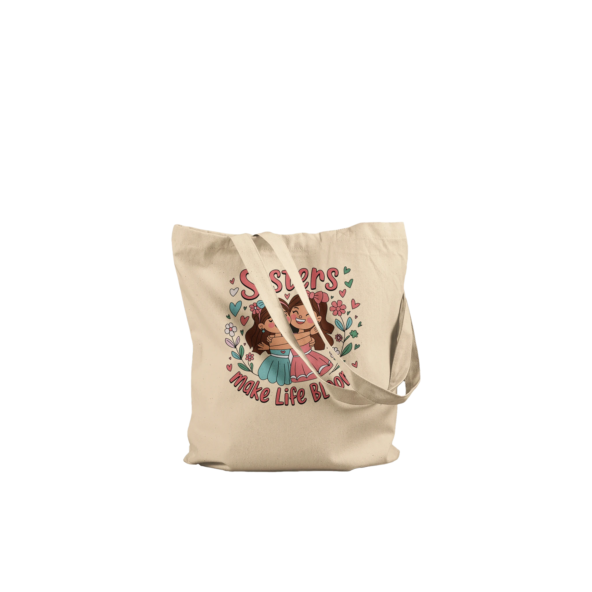 Our "Sisters Make Life Bloom" Tote Bag captures the essence of sisterly love with its lively and heartwarming design. Featuring two smiling sisters in a joyful embrace, adorned with whimsical flowers and playful hearts, this tote is a testament to the blossoming relationship shared by siblings. The vibrant colors and engaging artwork reflect the happiness and support sisters find in each other, making it a perfect accessory to remind them of their special bond.