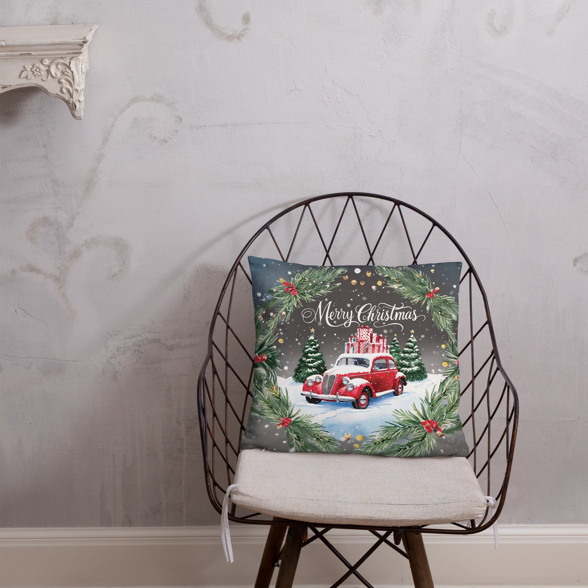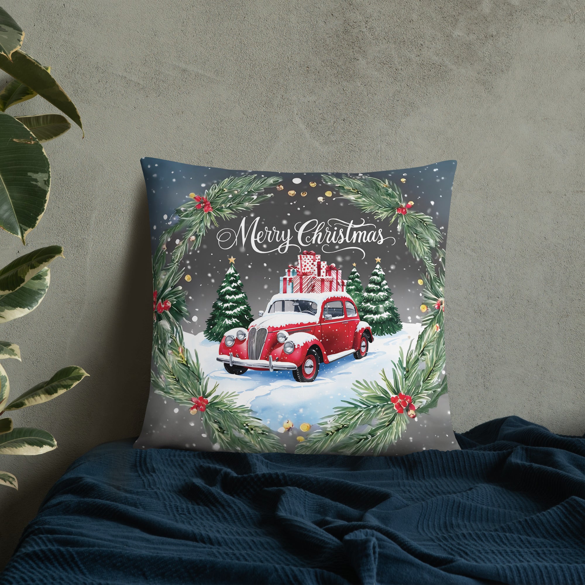 Turn your space into a winter wonderland with this charming pillow, featuring a vintage red car stacked with gifts, surrounded by snowy pines and a festive wreath. A heartwarming piece for anyone who treasures nostalgic holiday scenes—this gift is for Christmas lovers who cherish magical memories. A true Giftomory blend of gifting and memory.