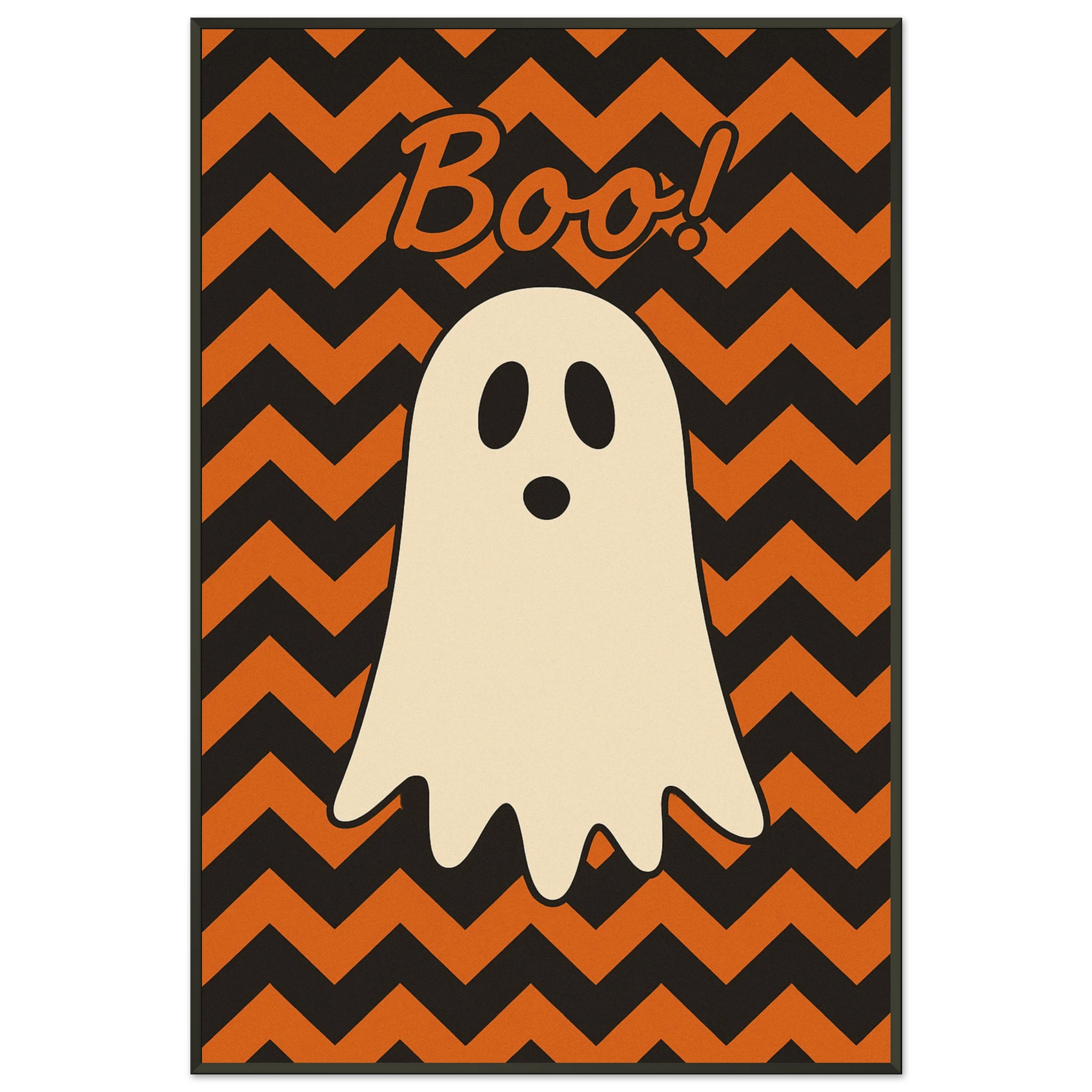 The Metal Framed Poster by Giftomory brings Halloween to life with a cheerful ghost and the word “Boo!” over a striking orange-and-black zigzag pattern. The design blends nostalgia with modern pop-art flair, making it an ideal décor choice. This gift is for anyone who loves playful, festive, and bold seasonal art that enhances ambiance while keeping memories alive—true to our brand ethos of Gift + Memory.