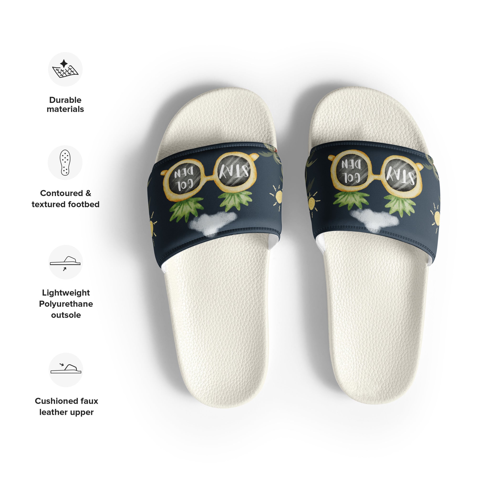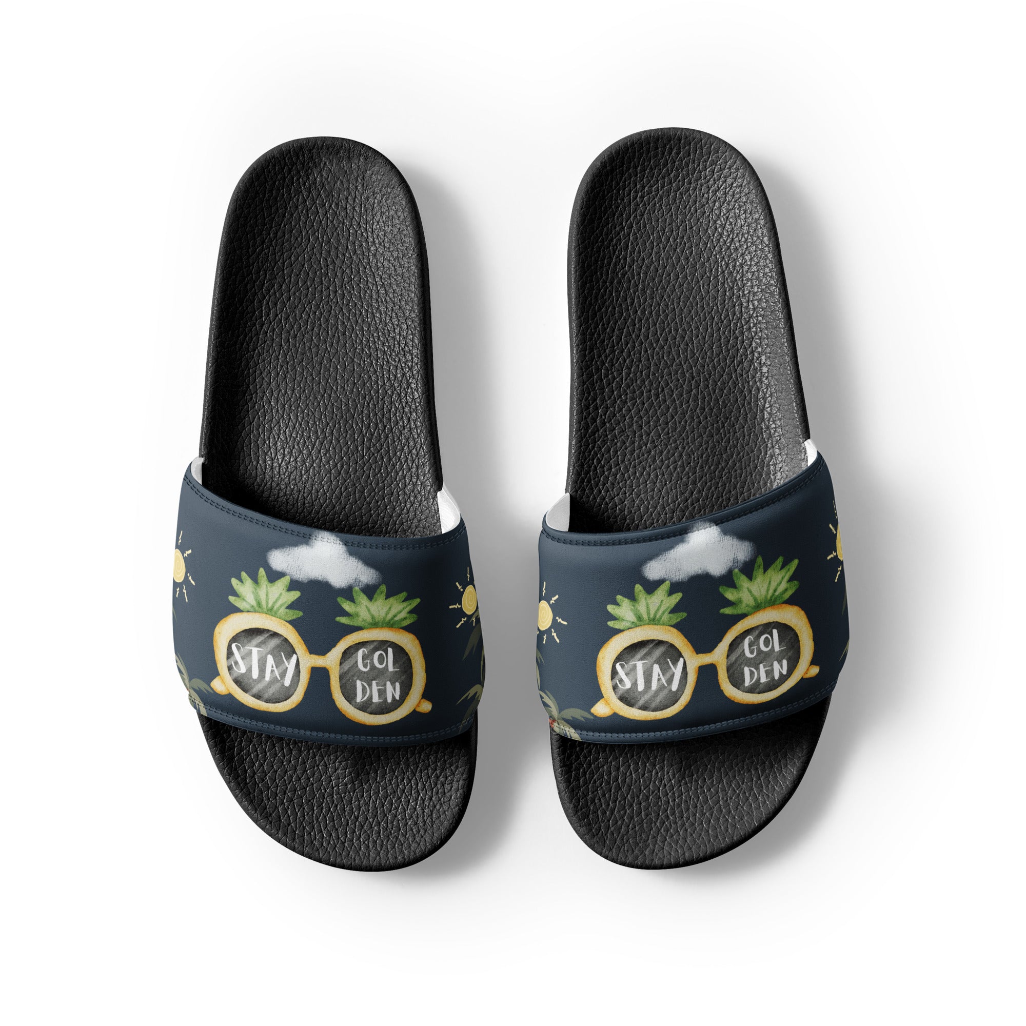 Bring the warmth of summer and the strength of friendship to life with these “Stay Golden” men’s slides by Giftomory. Designed for best friends who walk through life together, the artwork captures a dreamy coastal escape—sun-drenched clouds, cheerful suns, and tropical palms surrounding pineapple sunglasses with the phrase “Stay Golden” across the lenses. This fusion of playful whimsy and heartfelt sentiment makes these slides more than just footwear—they're wearable memories, crafted to spark joy, laughter, and the nostalgia of sunlit moments. Whether you're gifting your BFF or treating yourself, the design is a perfect reminder that golden memories are meant to be shared. Because at Giftomory, we believe every gift should hold a memory.