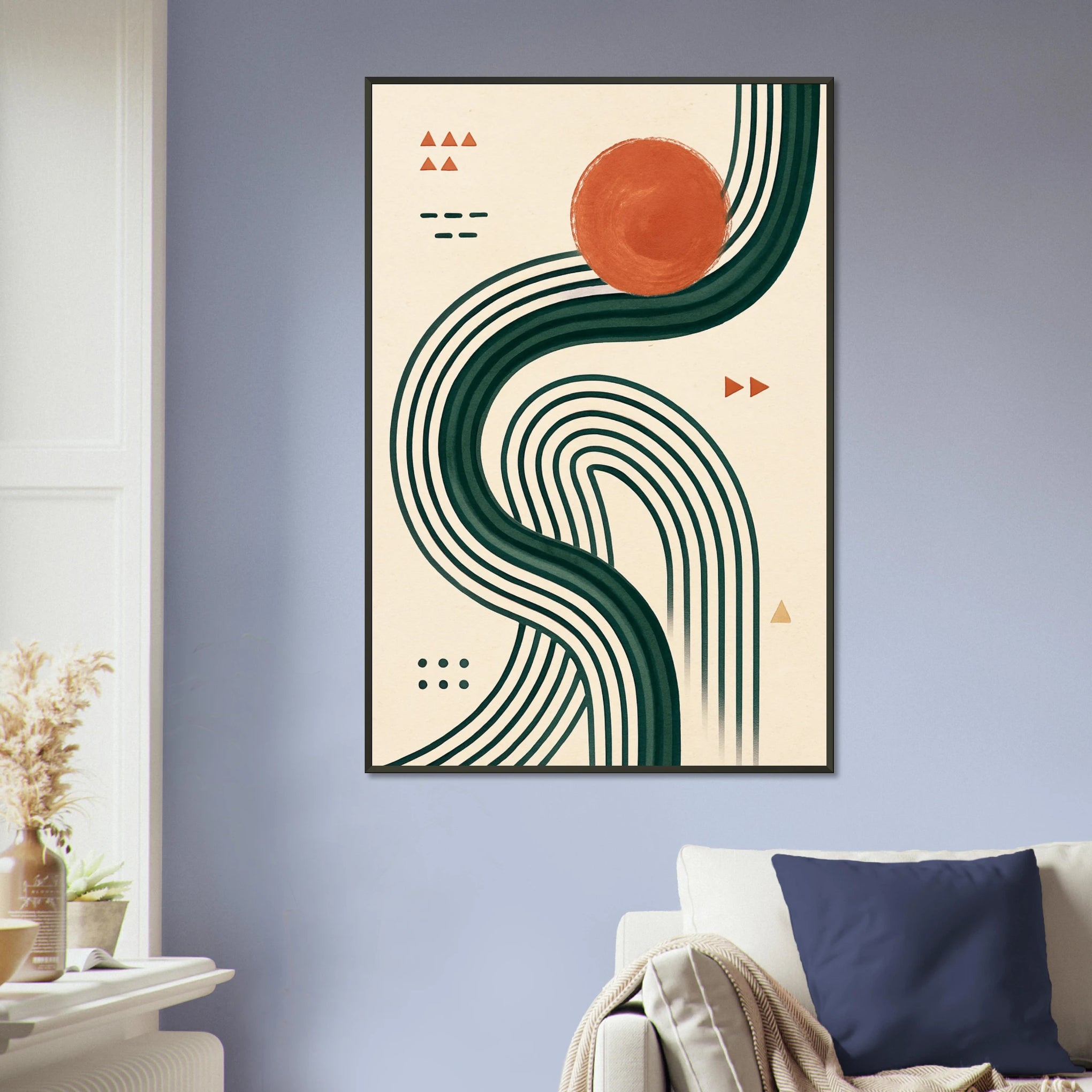 The Path of Motion metal-framed poster is a dynamic celebration of direction, balance, and creative flow. The bold green curves and warm terracotta sun create a visual journey—perfect for studios, entryways, or focused corners. This gift is for visionaries, creatives, and lovers of modern aesthetics. It embodies Giftomory’s mission: when art becomes a memory wrapped in meaning.