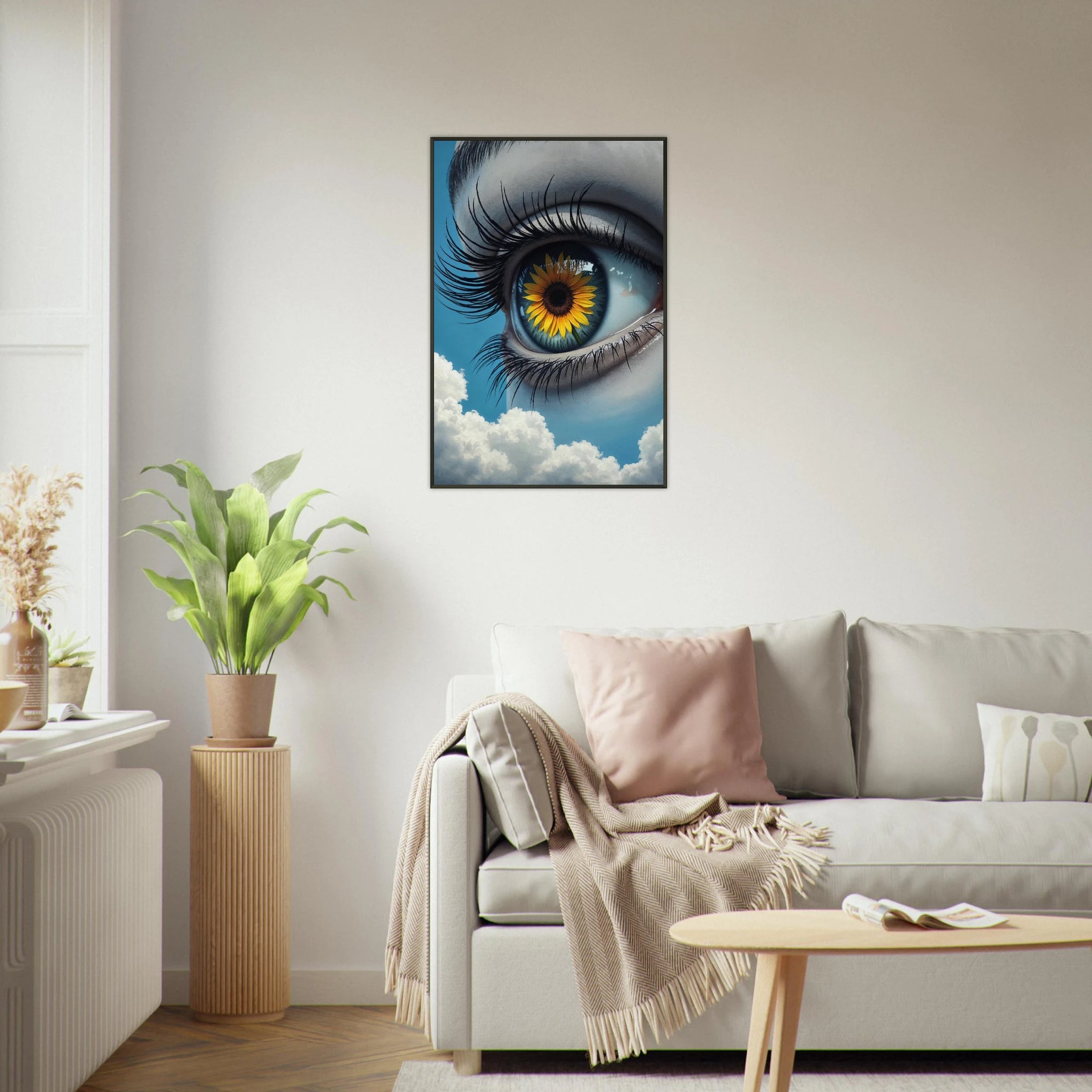 The "Sunflower Vision" framed print is a surreal and captivating piece, designed to evoke the joyful memories of seeing the world through a lens of optimism. The eye, a symbol of perception and emotion, reflects a vibrant sunflower, representing the beauty and warmth of life's moments. This design captures the emotional resonance of finding light in the everyday, making it an ideal piece to enhance your personal sanctuary or creative space. The soft, ethereal clouds and the delicate lashes create a dreamlike atmosphere, inviting viewers to ponder the deeper meanings of beauty and perception. Whether placed in a living room, bedroom, or studio, this artwork reminds you daily of the radiant beauty within and around you. "Gift a Memory, Cherish Forever," and let this piece bring a touch of whimsical wonder into your life.