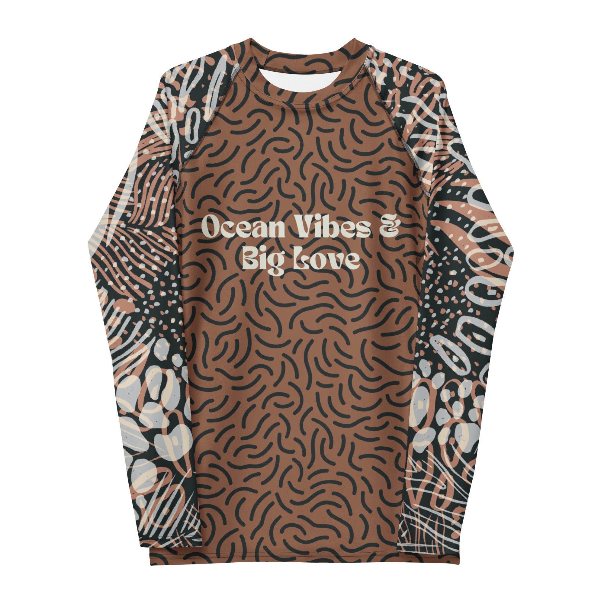 Immerse yourself in the serenity of the ocean with the "Swim Free, Love Deep" and "Ocean Vibes & Big Love" all-over swim shirt. The intricate fluid abstract wave patterns evoke the mystery and beauty of the deep sea, while the warm, earthy color palette of browns, blacks, and soft beiges creates a natural, timeless look. A subtle island and sailing motif adds an element of escapism—perfect for those who dream of sunlit shores and endless waves. Whether he's surfing, swimming, or enjoying a sunset on the beach, this boyfriend all-over swim shirt is a symbol of freedom, adventure, and love. Giftomory turns heartfelt emotions into unforgettable designs.