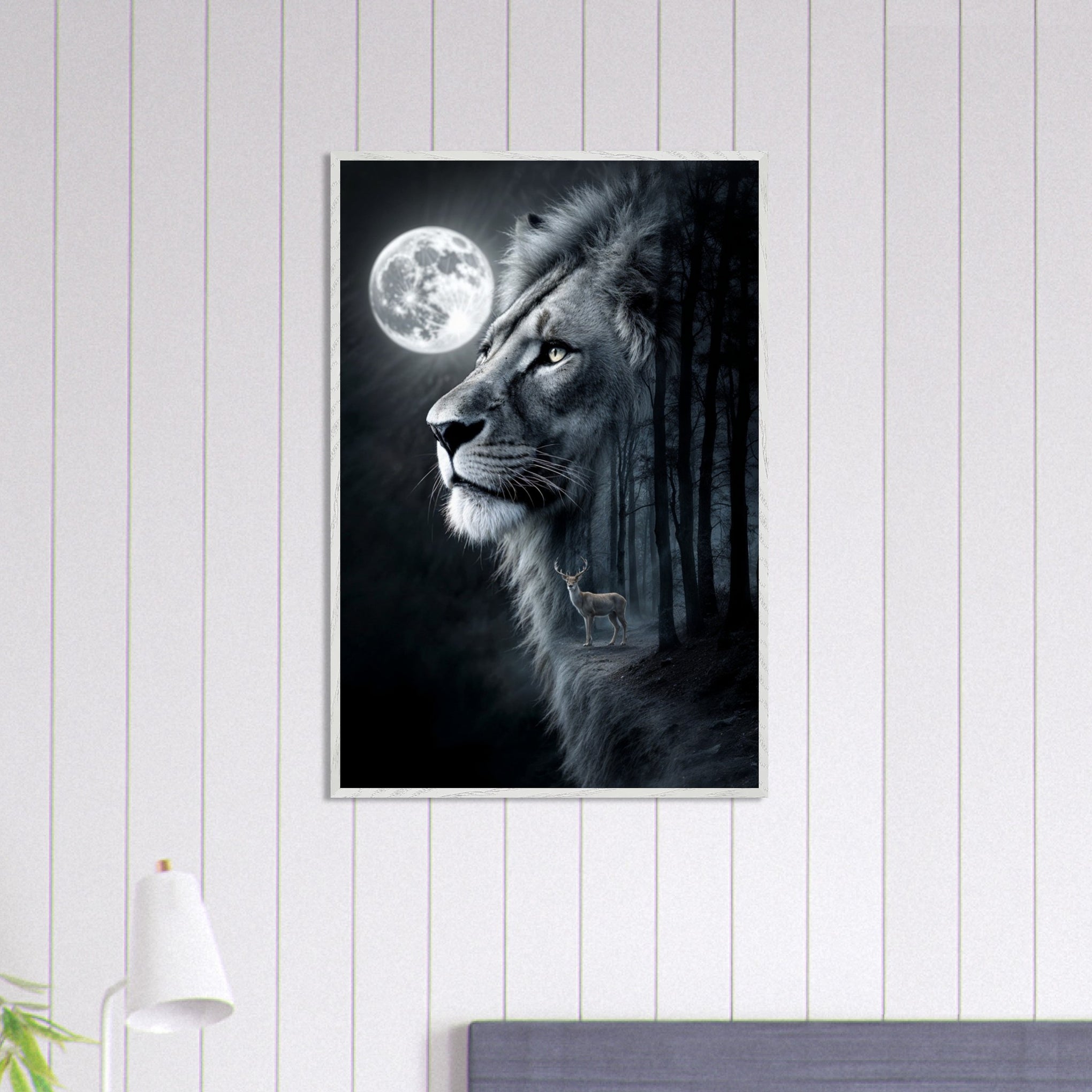 Step into a mystical forest under the glow of a radiant full moon with this evocative piece of wildlife art. The powerful lion, symbolizing strength and protection, and the delicate deer, a symbol of grace, coexist in harmony amidst a surreal, moonlit backdrop. Framed in responsibly sourced wood, this fine art print exudes elegance and calm, ideal for living rooms, bedrooms, or study spaces. The deep contrasts and rich details create a connection to nature and its mysteries. Make it memorable. Gift it to yourself or someone else. This Premium Wooden Framed Poster offers a perfect blend of sophistication and durability.