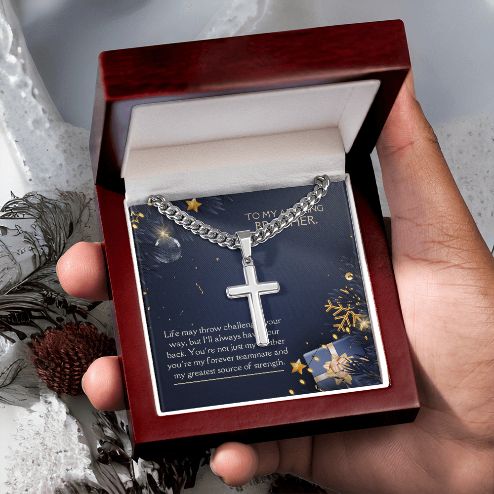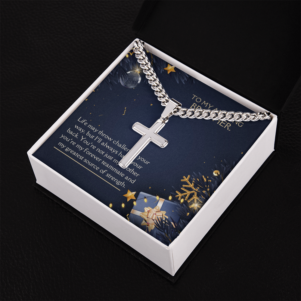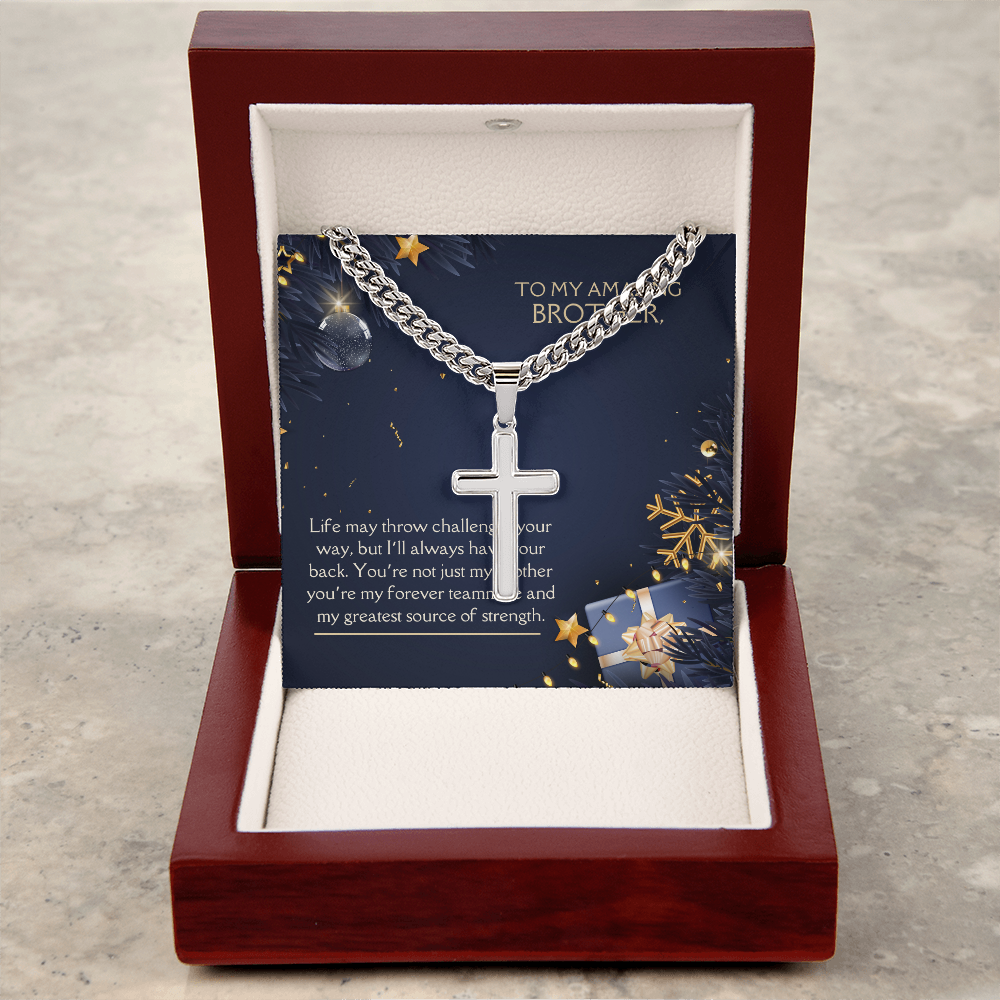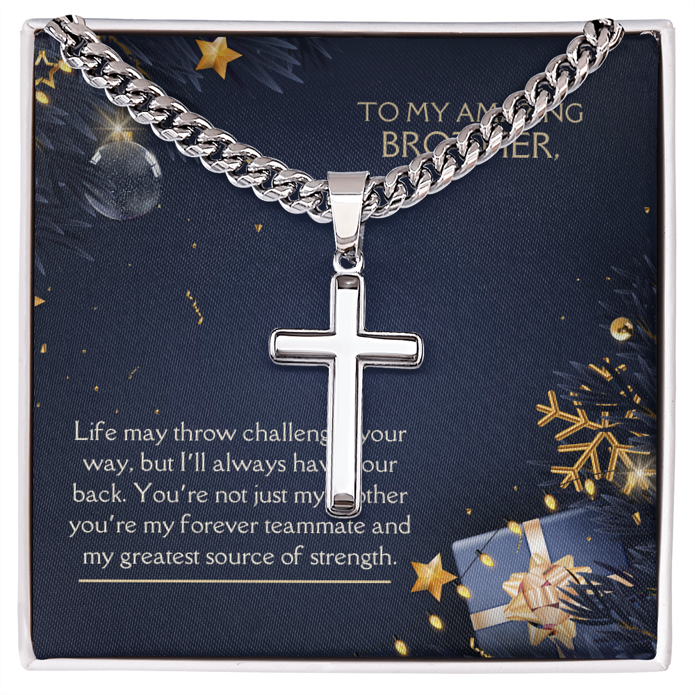 - Stainless steel Cuban chain with artisan-style cross pendant