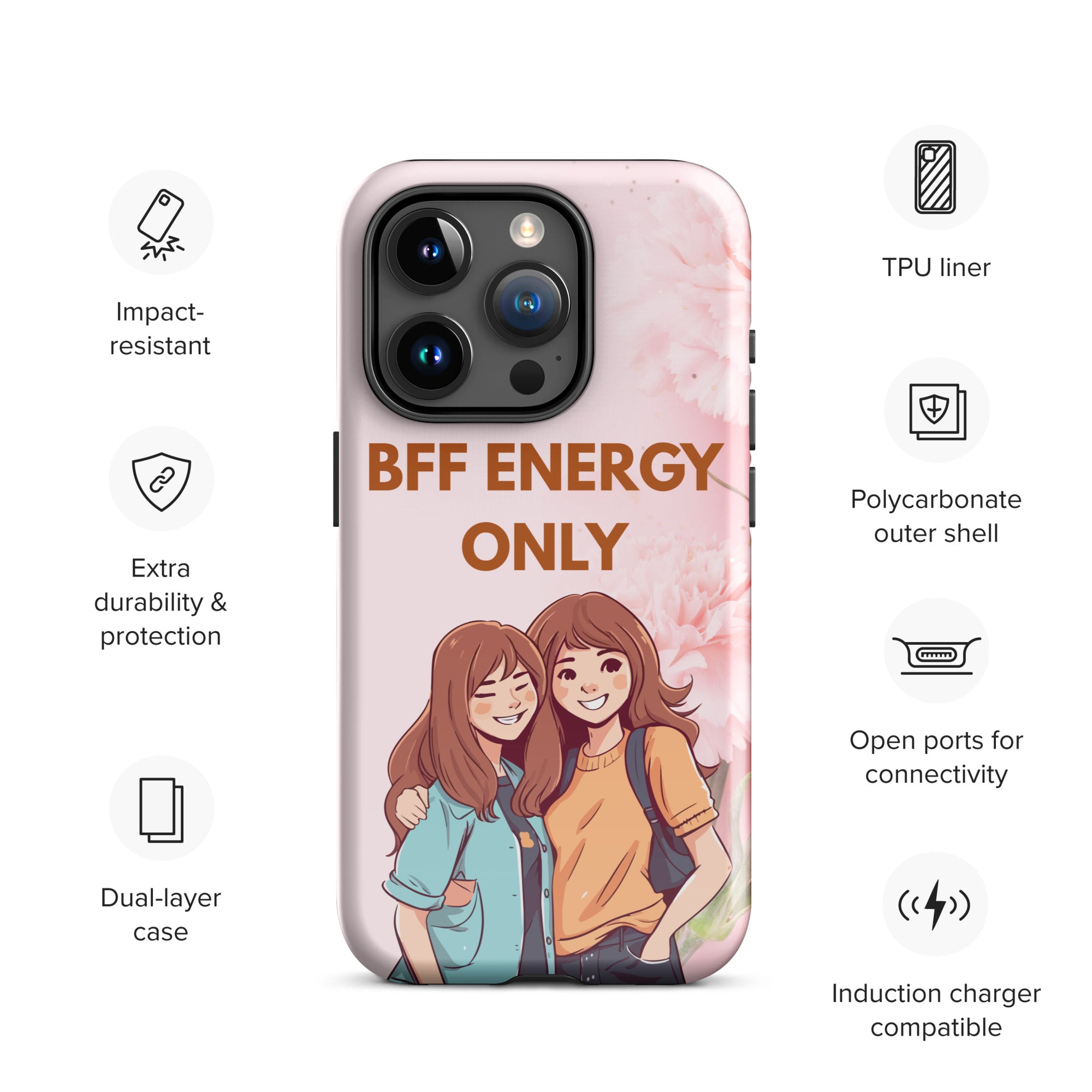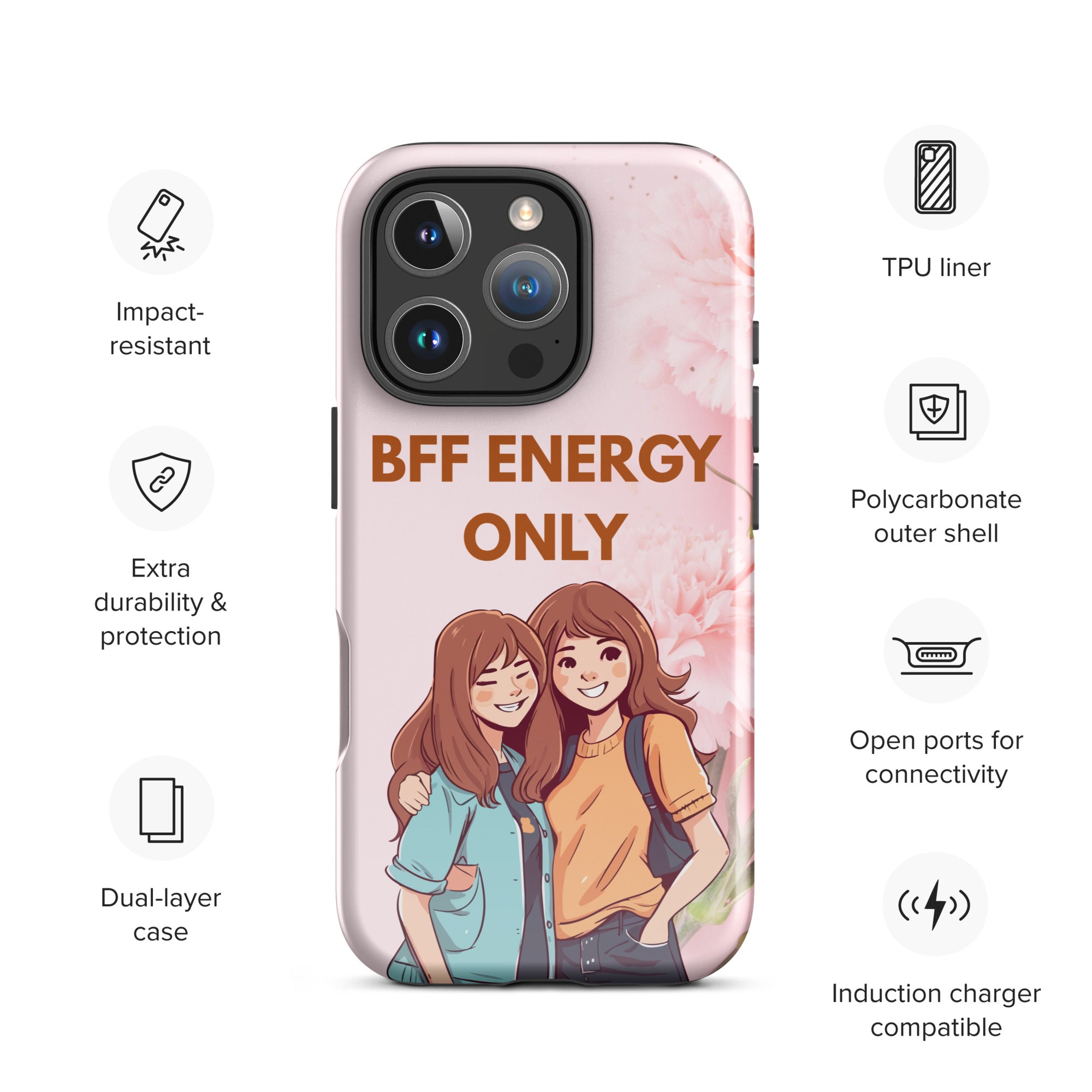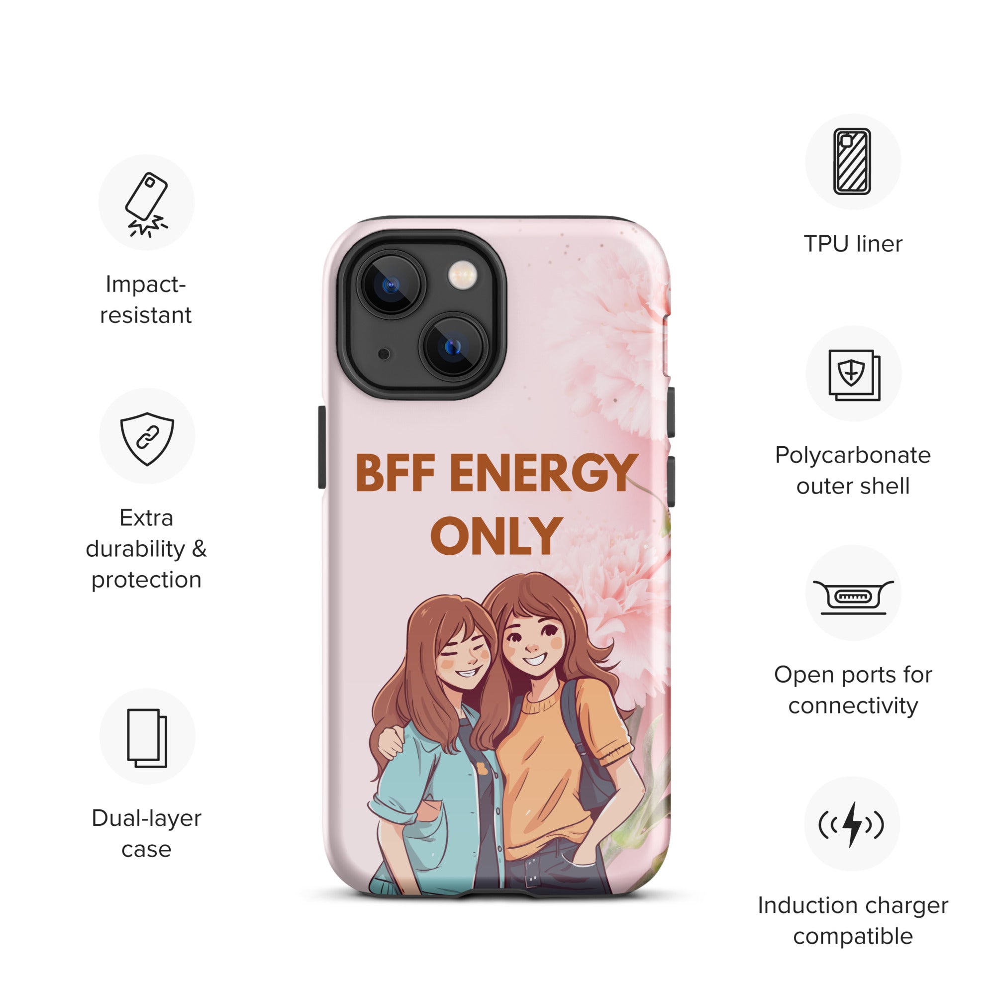 The BFF Energy Only Tough iPhone® Case captures the warmth and joy of true friendship through soft pink florals, uplifting colors, and an adorable bestie illustration. Perfect for gifting, this design is a heartfelt keepsake that blends Gift + Memory, creating a daily reminder of cherished moments. This gift is for best friends who love celebrating their bond in style.