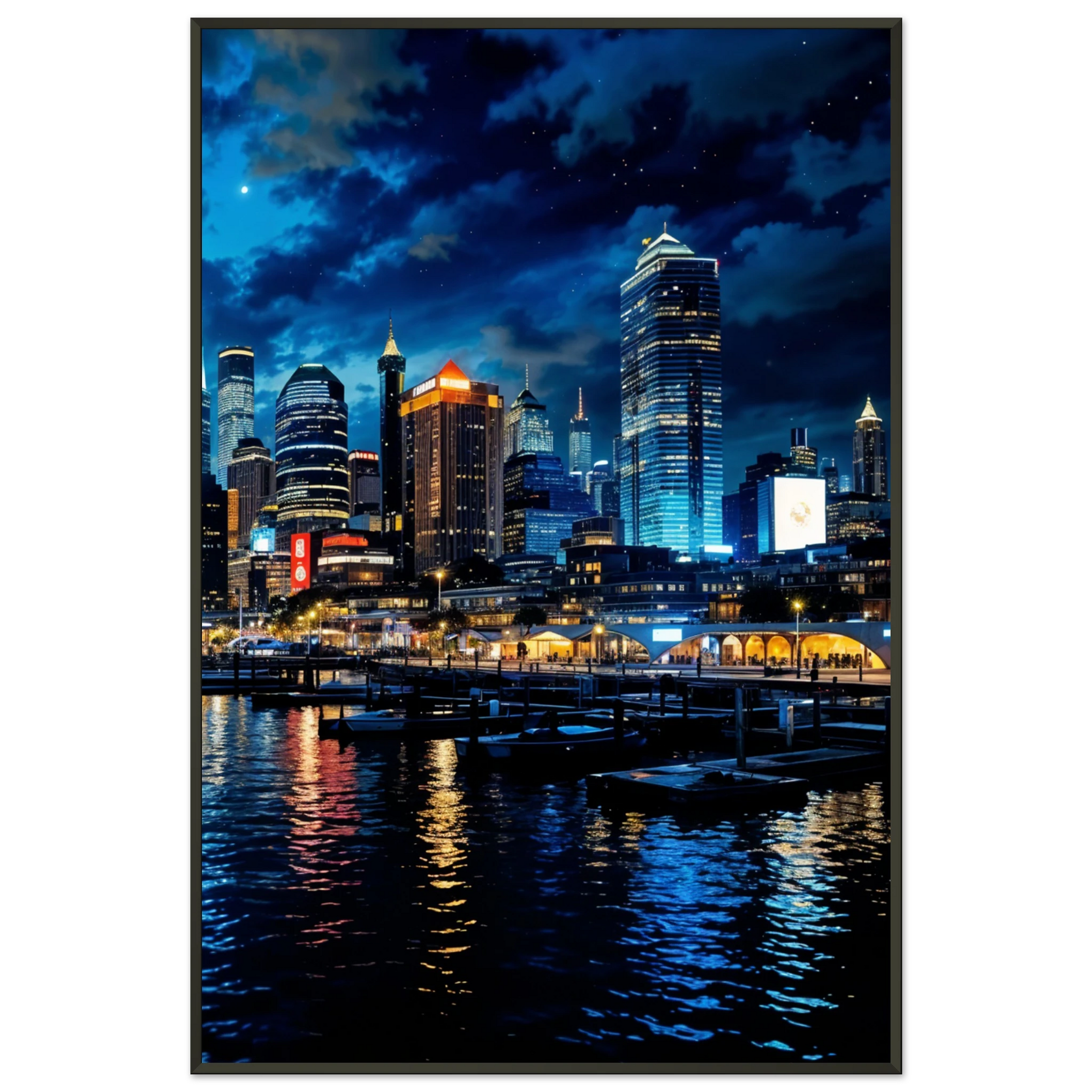 This stunning 24x36" Metal Framed Poster night cityscape immerses you in the quiet energy of a glowing skyline mirrored in gentle harbor waters. The artwork pulses with vibrant hues of electric blue, warm amber, and soft golden light, highlighting the architectural silhouettes of towering skyscrapers. Ripples on the water dance with color, while the deep night sky—studded with stars—casts a tranquil contrast to the buzz below.