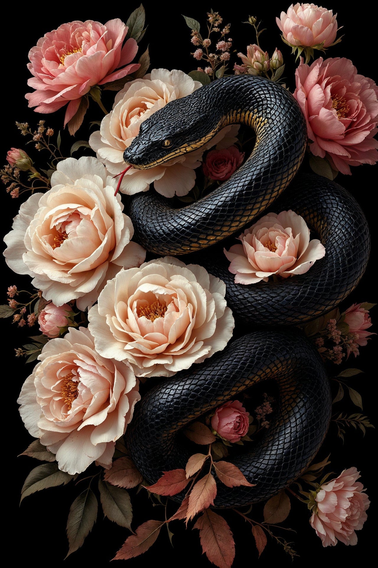 Venom & Velvet – Metal and Wood Framed Poster Set fuses fierce elegance with visual seduction. One print features an ivory snake coiled through deep burgundy and blush peonies; the other, a sleek obsidian serpent wrapped in creamy roses. This mesmerizing duo speaks of duality—danger and grace, instinct and bloom. This gift is for the one who thrives in contrast, who sees beauty in strength and softness alike. A powerful symbol of transformation and sensuality, it’s the perfect piece for statement-makers and lovers of art with edge. Make it memorable – Gift it to yourself or someone else.
