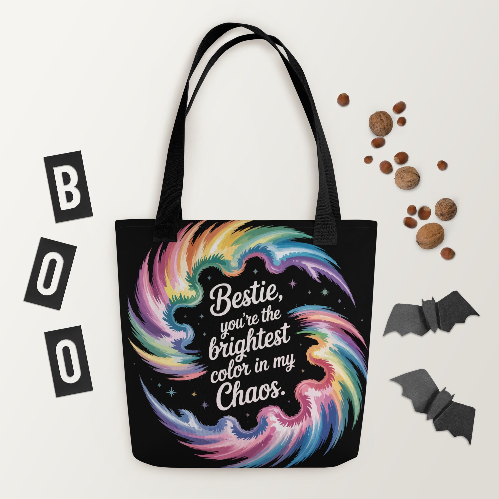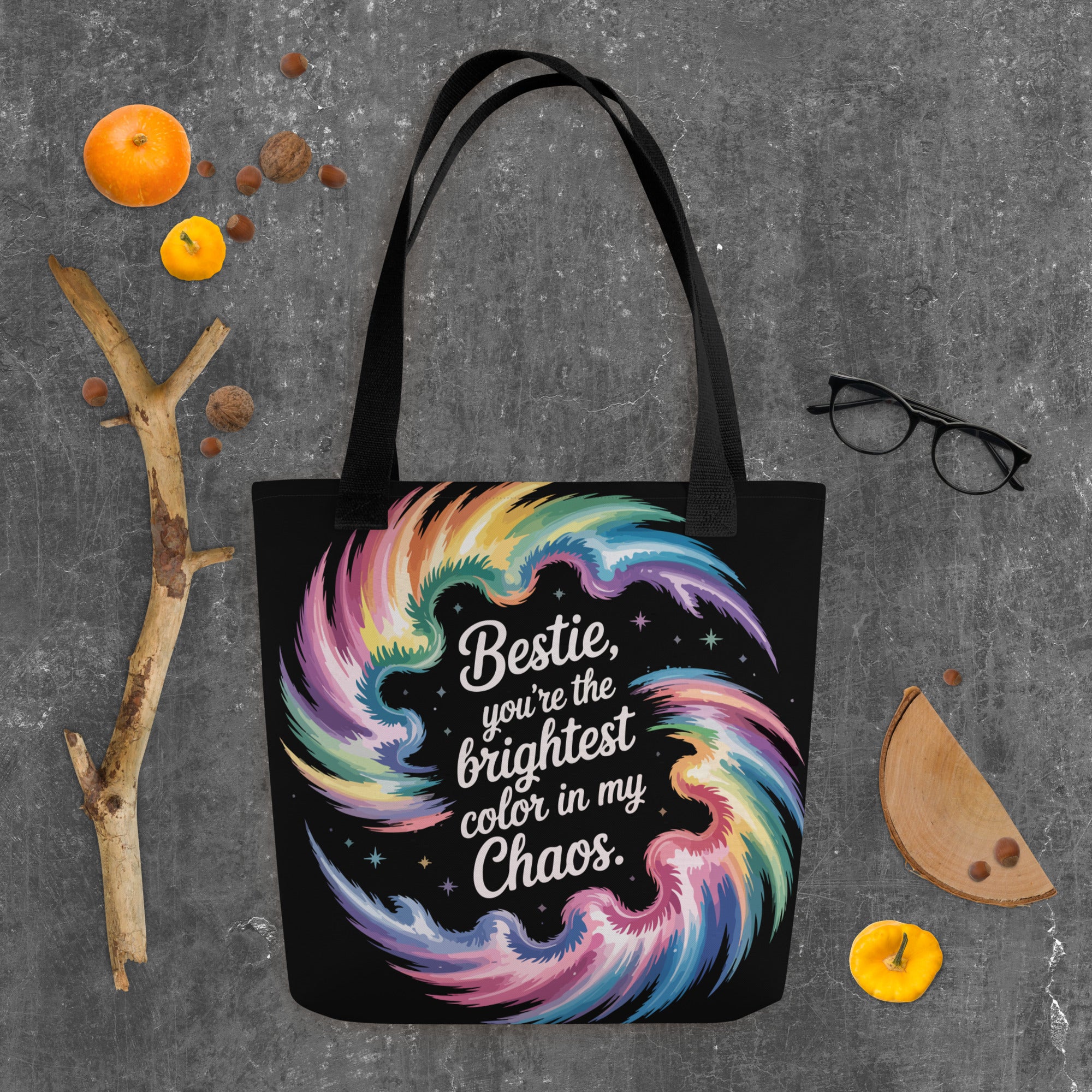 The "Bestie, You're the Brightest Color in My Chaos" tote bag embodies the lively, chaotic, and beautiful nature of true friendship. With vivid, rainbow hues swirling in a cosmic pattern, it’s a perfect tribute to the friend who adds color to every moment. This gift is for the one who makes your world shine brighter, no matter the storm.