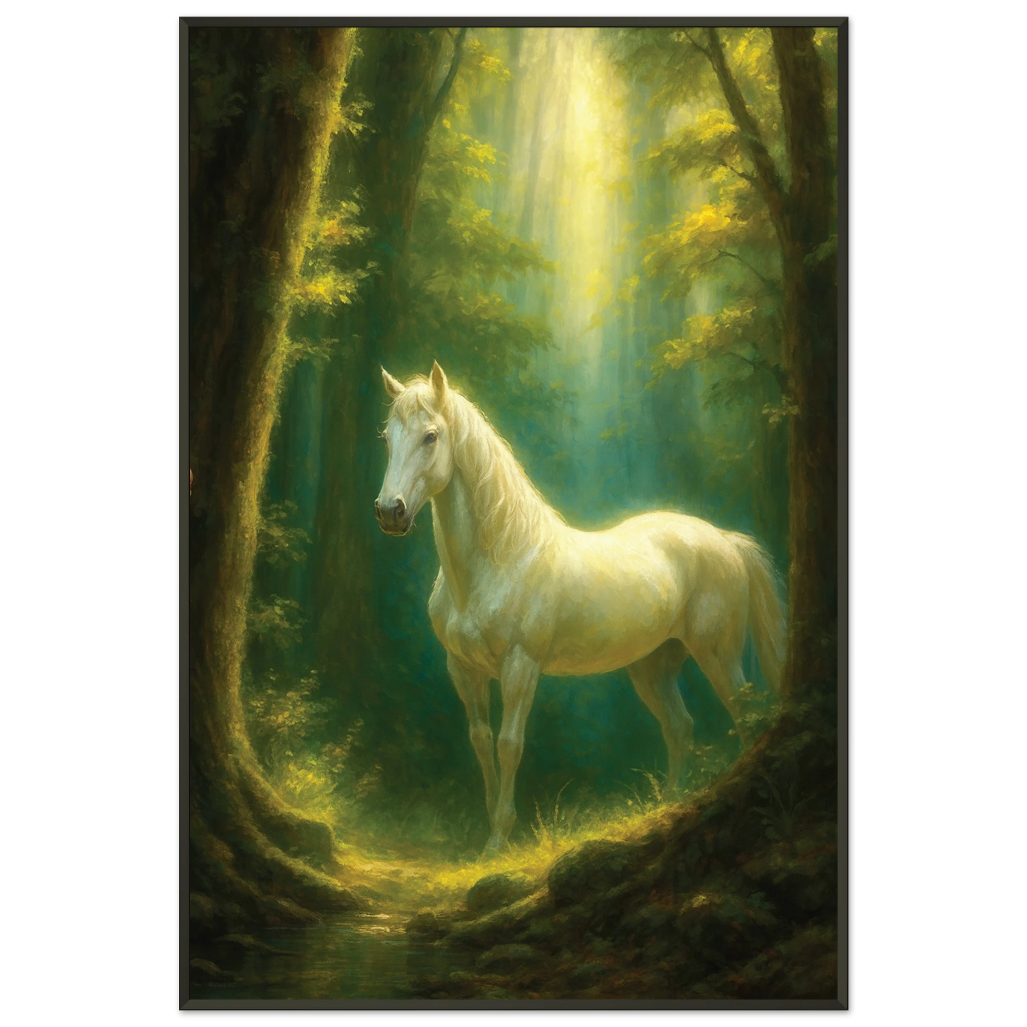 The Metal Framed Poster depicts a majestic white horse glowing under golden rays, framed by a lush forest. This gift is for nature lovers, dreamers, and art enthusiasts who seek beauty that symbolizes grace, strength, and serenity. True to Giftomory’s Gift + Memory ethos, it enhances any living room, bedroom, or study with timeless, tranquil ambiance.
