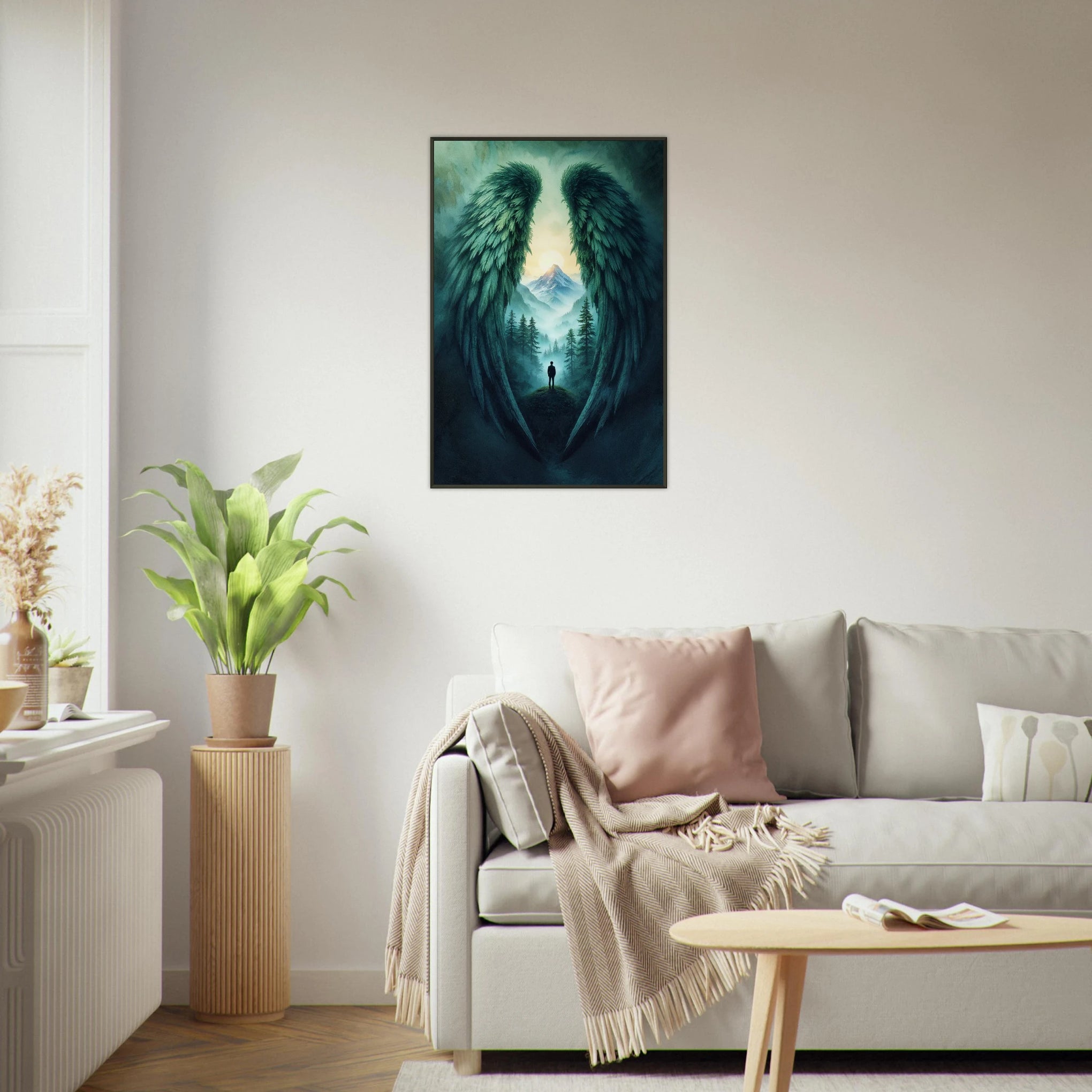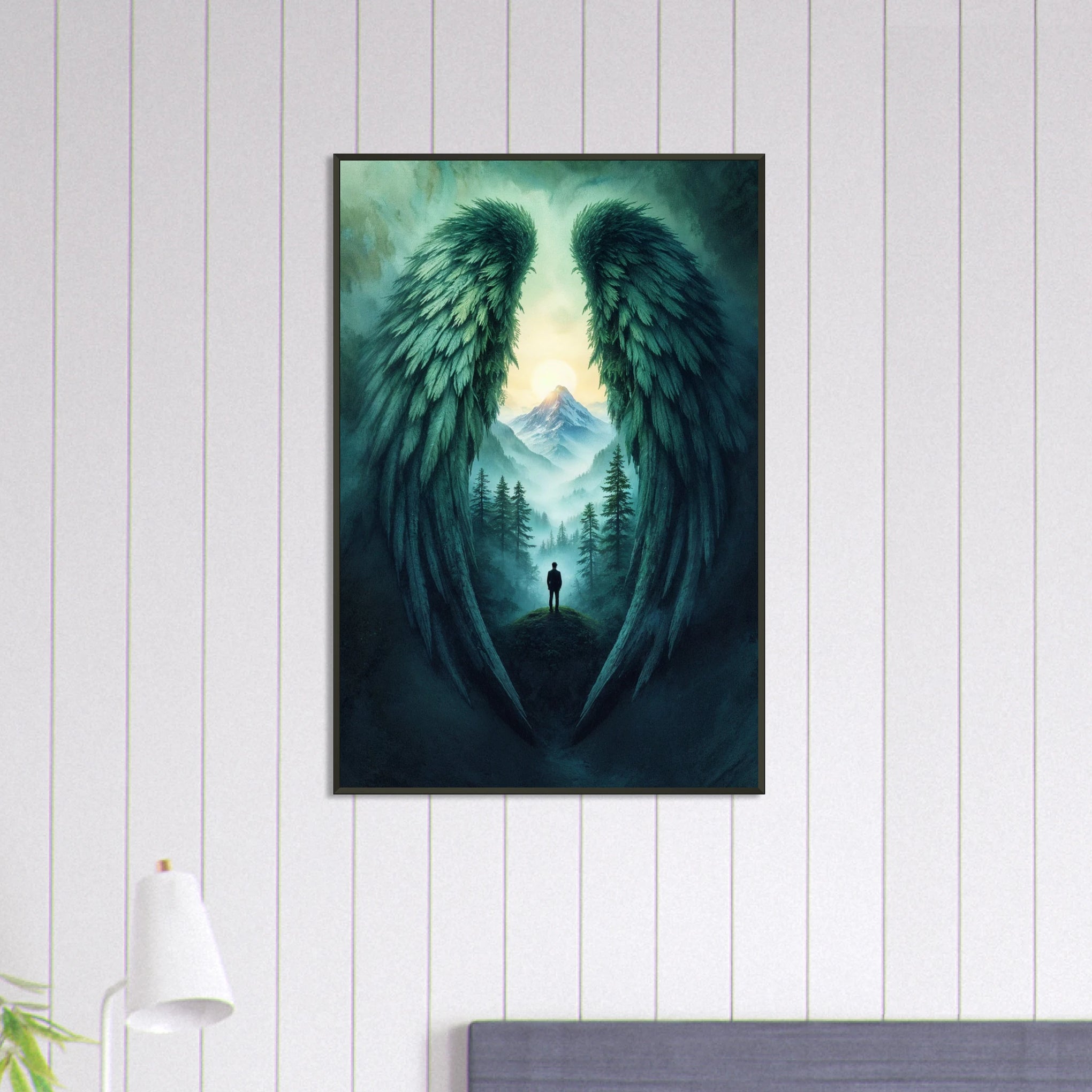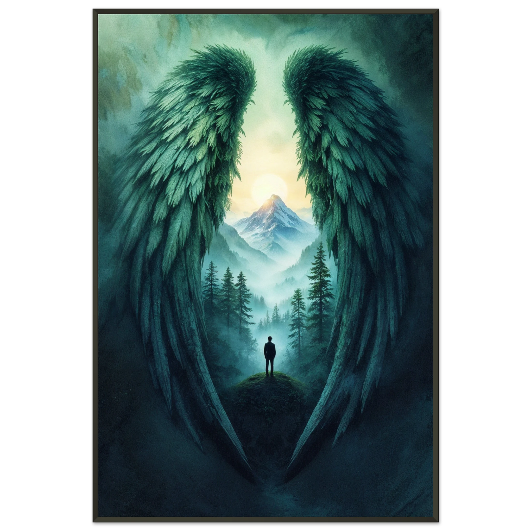 "Wings of Solitude" is a powerful visual narrative that invites contemplation and introspection. The dramatic composition, featuring angel wings framing a solitary figure in a misty valley, creates a sense of both protection and solitude. This piece is designed to foster a serene and reflective ambiance, ideal for spaces where you seek peace and inspiration. At Giftomory, we believe in the power of "Gift" and "Memory," and this artwork embodies that ethos, making it a thoughtful gift or a personal treasure, especially for mom. The artistic elements, such as the detailed feather textures, the misty atmosphere, and the soft, ethereal light on the distant mountain, contribute to the overall mood of mystery and hope.