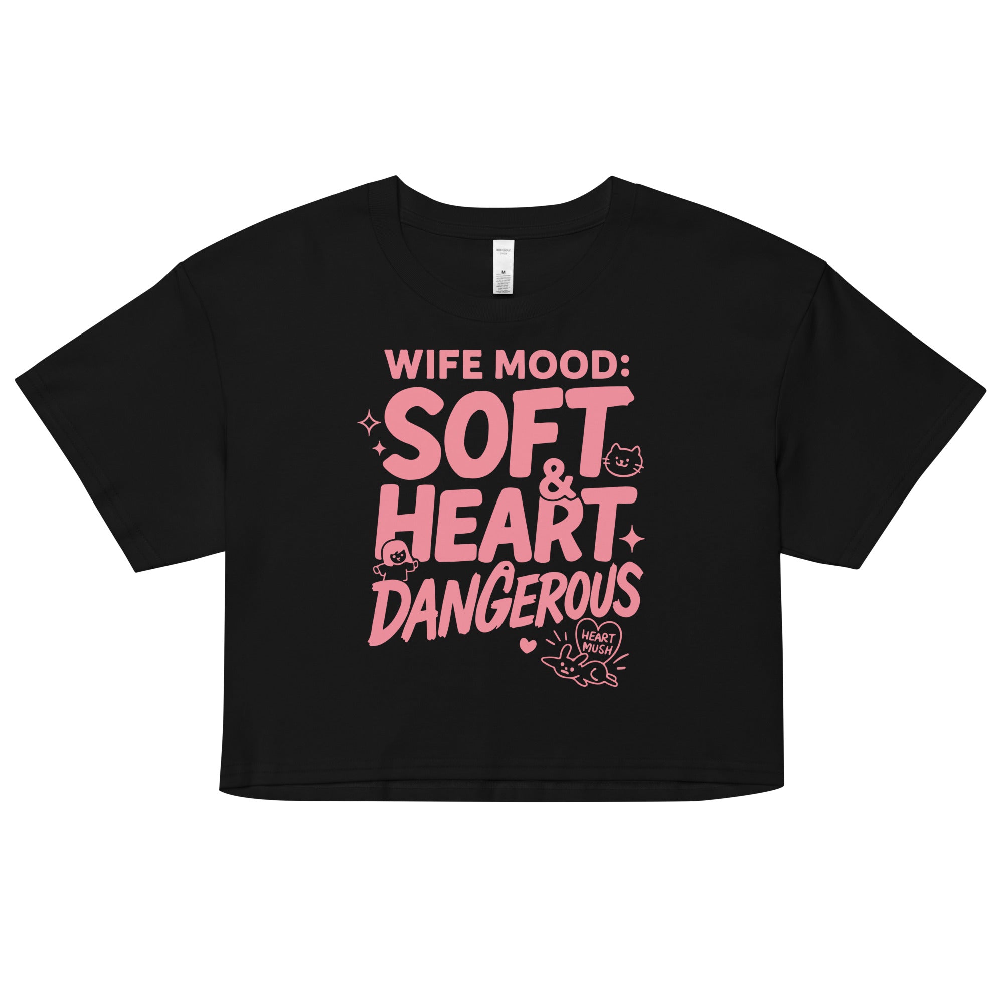 Fun, flirty, and full of charm—the Women’s Crop Top displays the bold statement “Wife Mood: Soft & Heart Dangerous” in vibrant pink with adorable cat and bunny doodles. It’s the perfect way to express love and celebrate her personality, embodying Giftomory’s “Gift + Memory” promise. This gift is for your wife, making her smile every time she wears it.