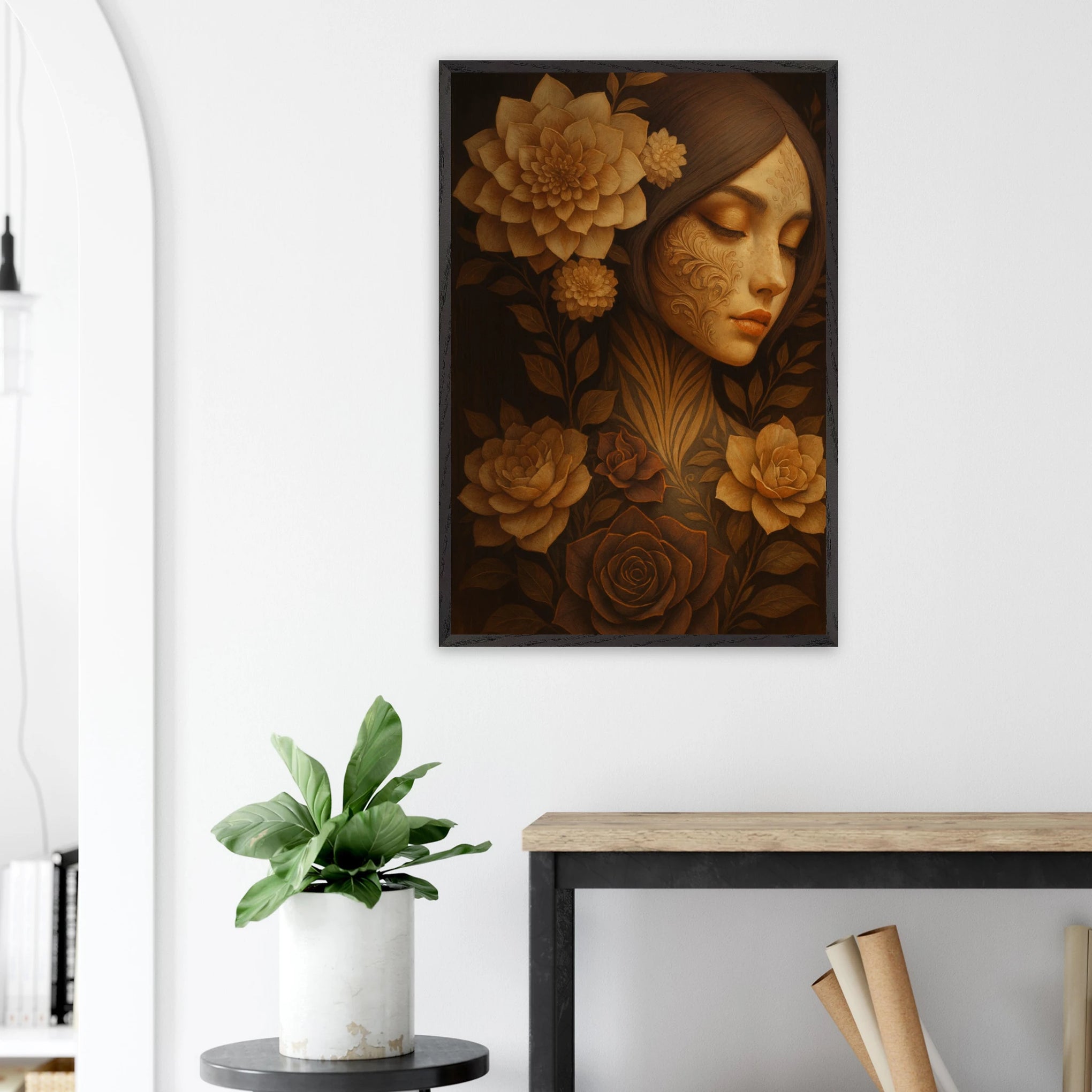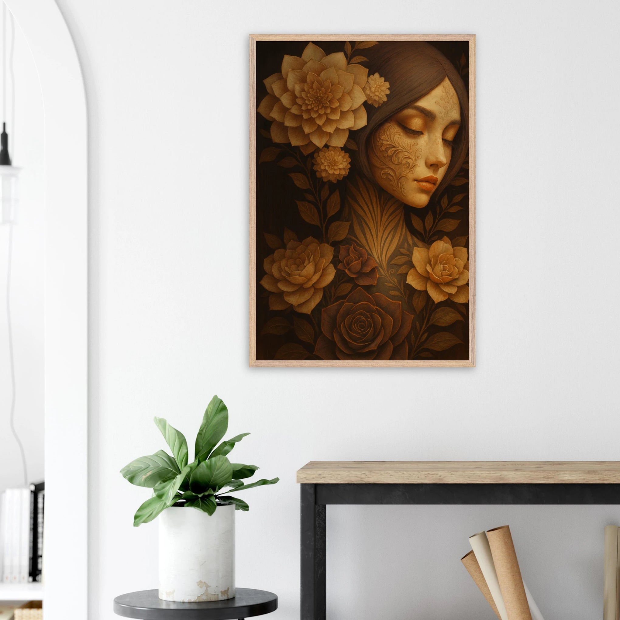 This Giftomory Wooden Framed Poster blends human elegance with floral splendor, capturing a serene female portrait adorned with roses and intricate botanical details. Soft golden-brown tones radiate warmth and timeless beauty, evoking themes of grace, reflection, and love. This gift is for anyone who cherishes art that intertwines memory, beauty, and emotion—perfectly reflecting our ethos: Gift + Memory.
