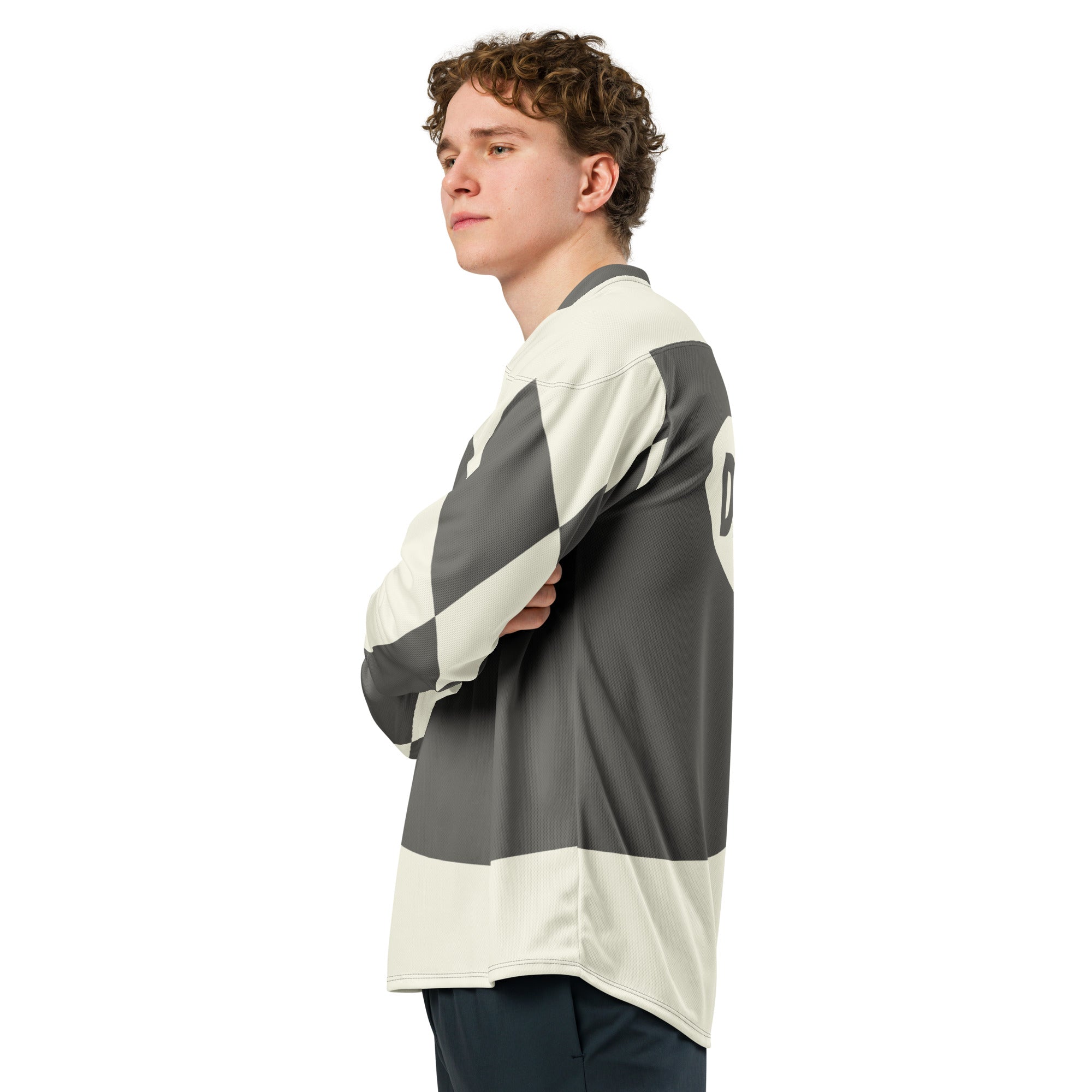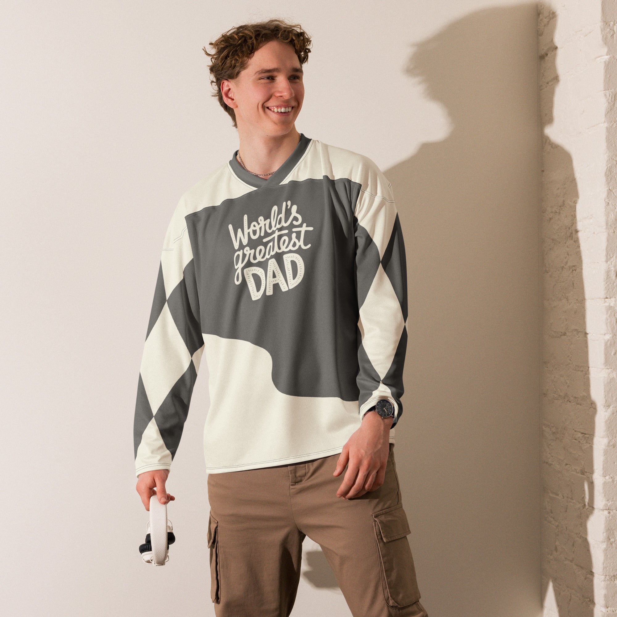 The World’s Greatest Dad Recycled Hockey Fan Jersey is a simple yet powerful design made to honor a father’s irreplaceable role. This gift is for the dad whose love stands tall in every chapter of life. With a clean cream-and-charcoal palette, abstract shapes, and the bold front message, it radiates appreciation. The heart symbol and “DAD” typography on the back complete the emotional statement, perfectly reflecting our Gift + Memory mission.