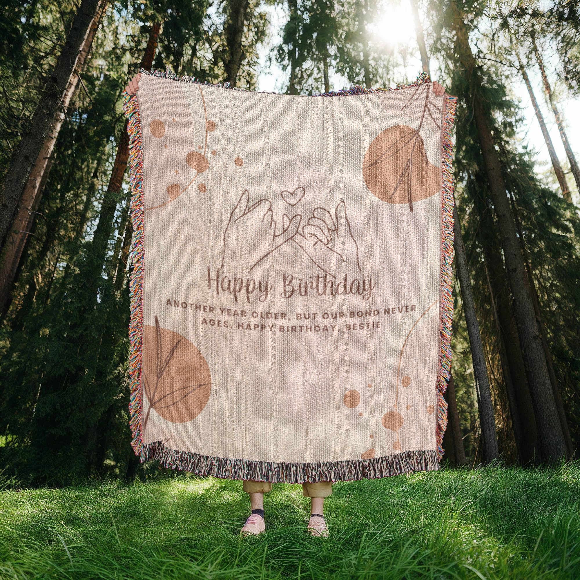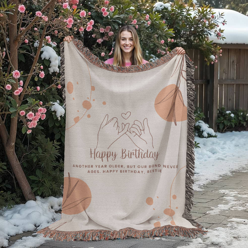 This gift is for your best friend — the one who makes every year brighter. The Heirloom Woven Blanket showcases an emotional line-art design of pinky promise hands and a heart, surrounded by soft earthy tones and abstract shapes. This minimalist yet meaningful artwork captures timeless friendship. Perfect for cosy spaces, this blanket adds a sentimental and artistic touch to any room. It’s not just a blanket—it’s a gift + memory.